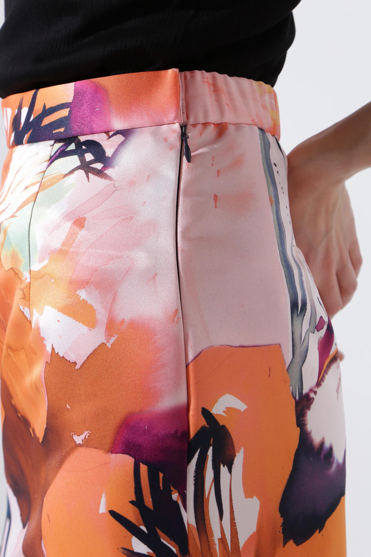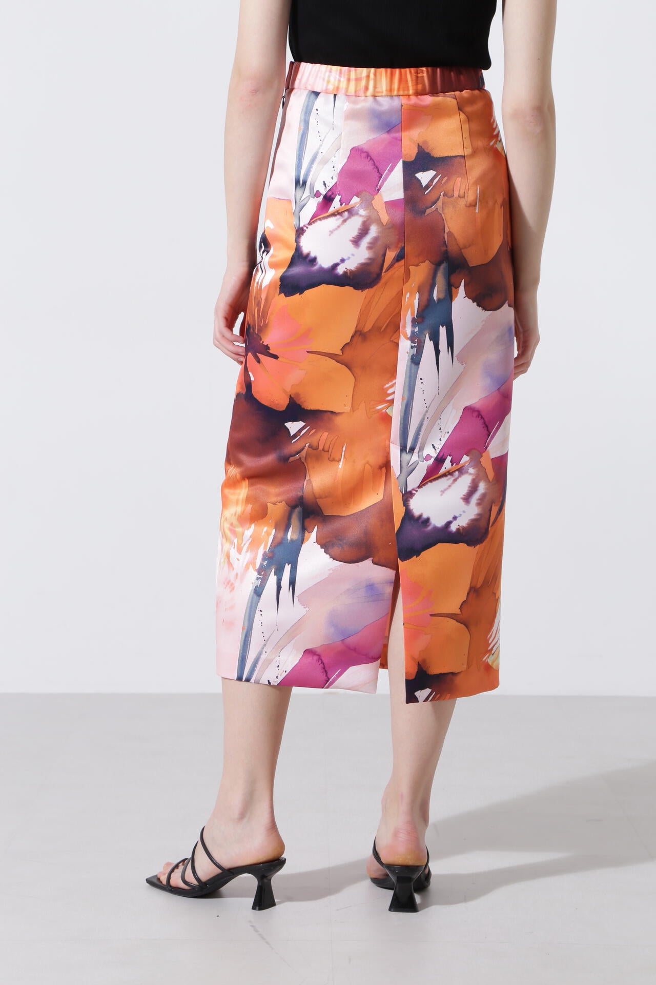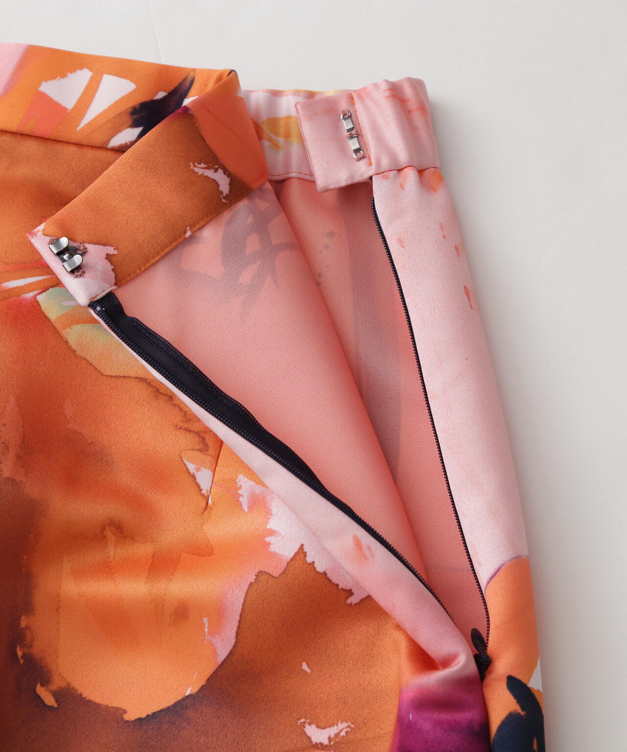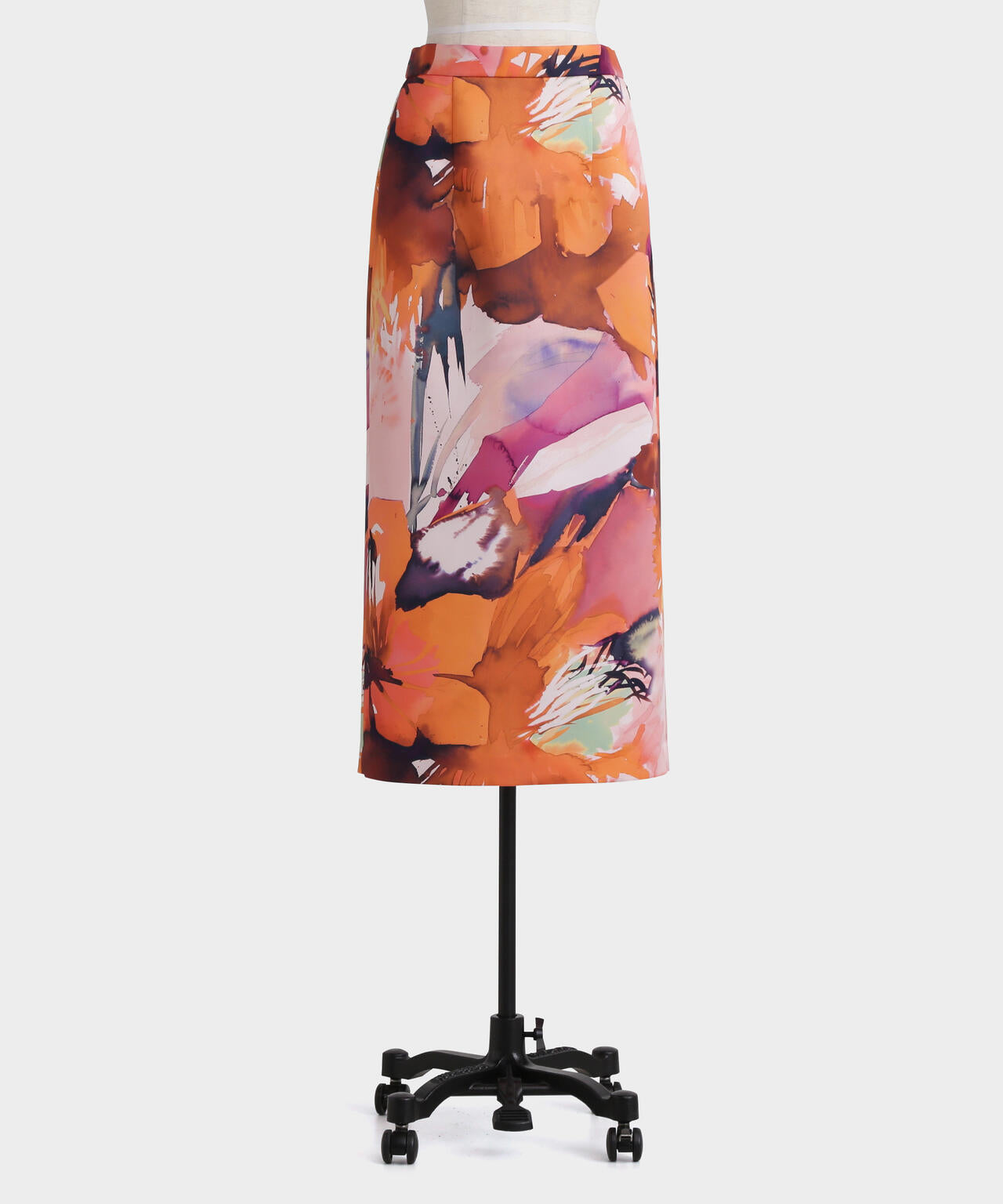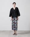 先染め織物やプリントを得意とする老舗メーカーで、プリントはすべて自社で一貫生産されているというこだわりの素材です。特徴的なグラフィックは裏側にまでプリントを施し、細部にまで丁寧さが宿る仕上がりに。そんな上質なプリント素材をあえてミニマルなタイトスカートに仕立てることで、柄の美しさが際立ち、大人の洗練を感じさせるデザインに仕上げました。