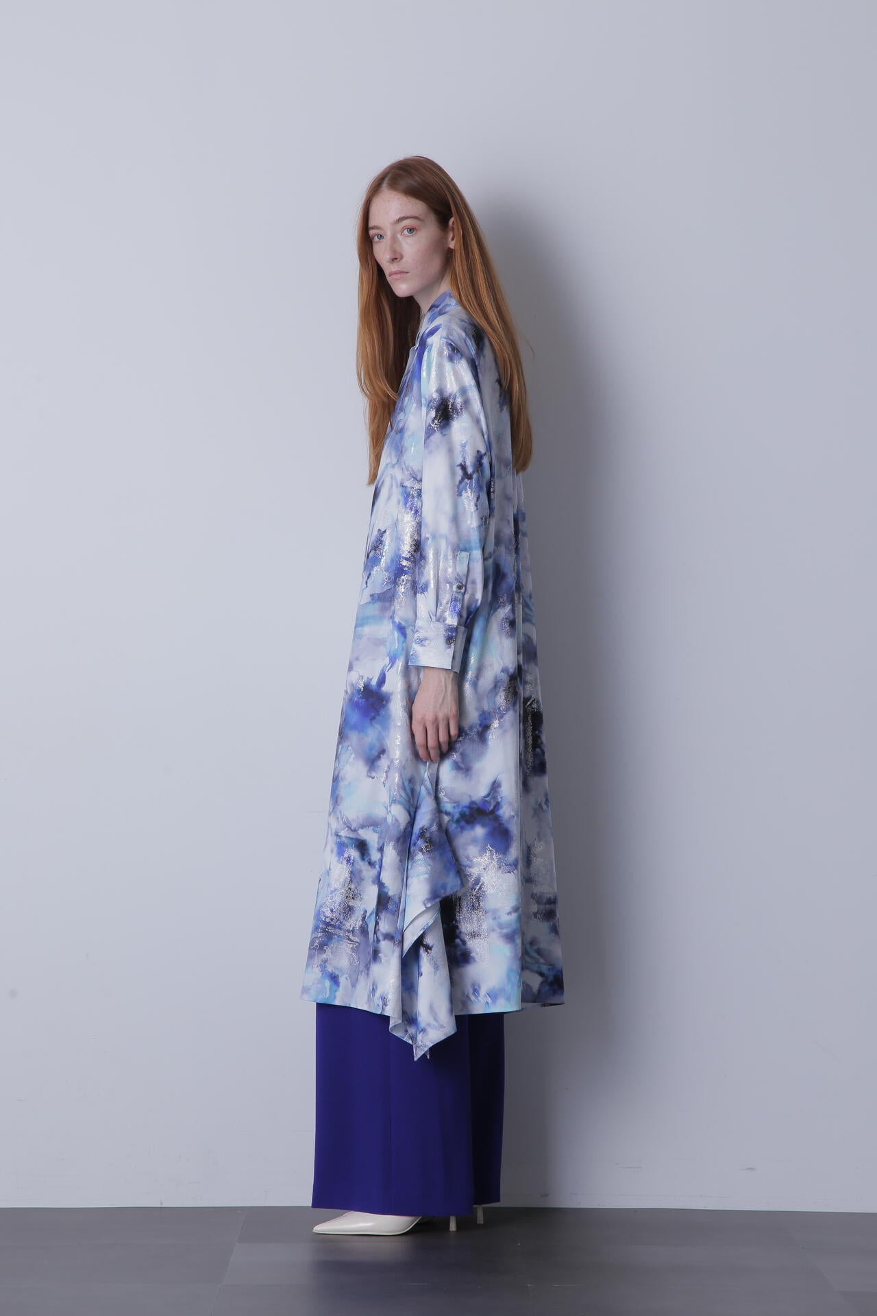 ブルーとシルバー箔がアーティーな印象のプリント。サイドのパーツが動くたびに揺れる、ミニマルながらも華やかさのあるシャツドレスです。