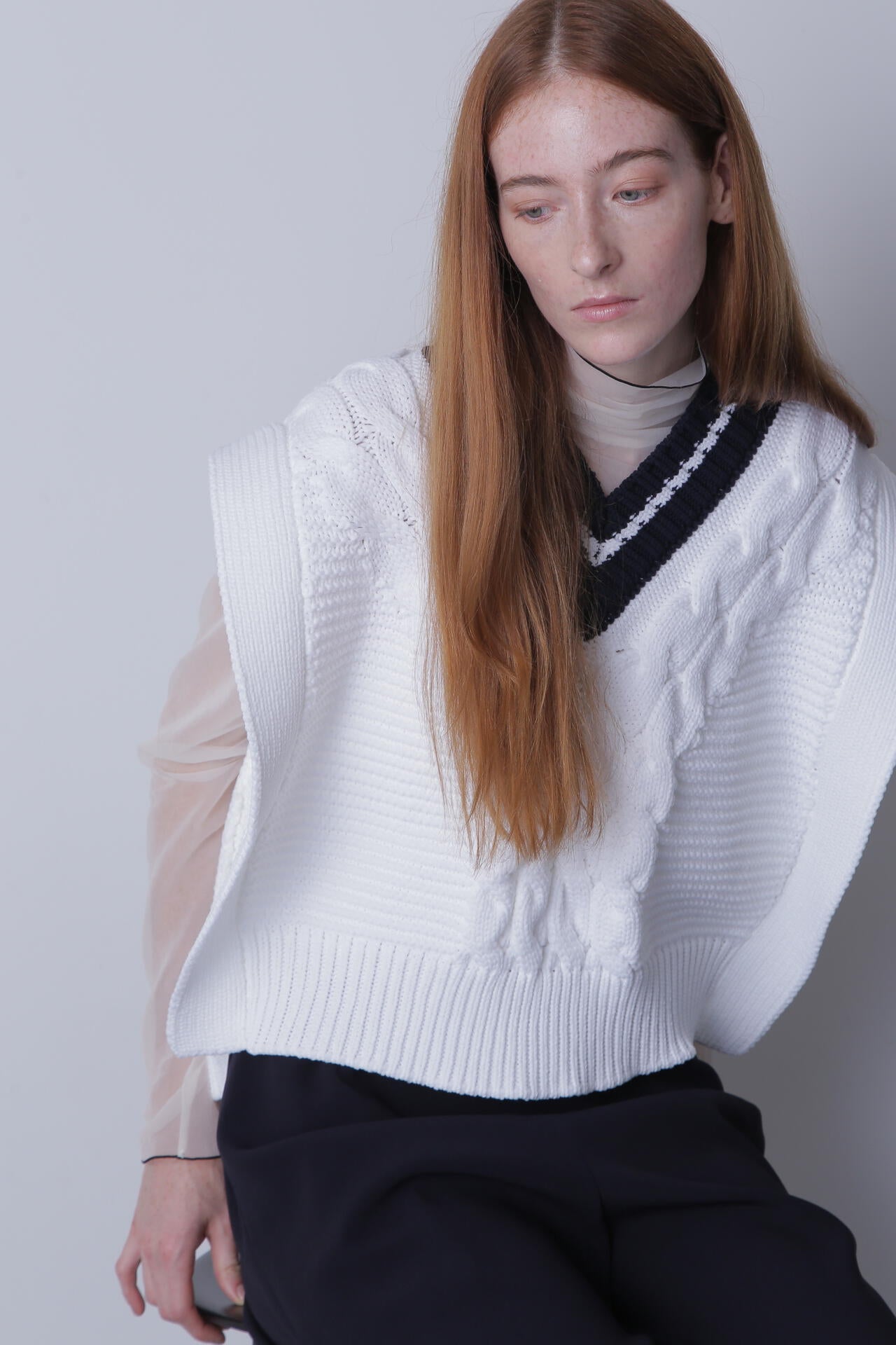 バイカラーでブロッキングしたケーブル編みがポイントのサイドをボタンで止めて着用するニットベスト。