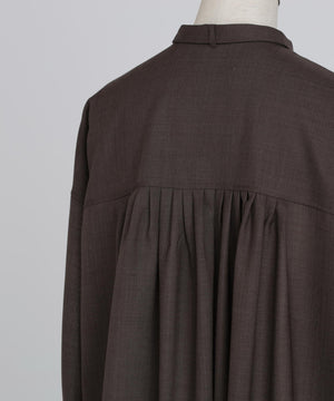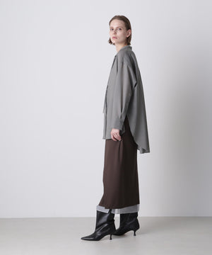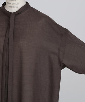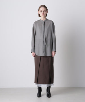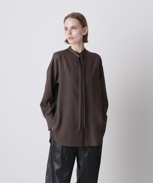 モードな印象のボウタイブラウス。ミニマルなバンドカラーに、取り外し可能な細いリボンタイを組み合わせ、ボタンを隠したフロントフライのディテールで、シンプルながら洗練された表情を演出しています。TW混紡糸を使用した平ボイル素材は、ウールでありながらシワになりにくく、滑らかで程よいシャリ感と膨らみを持ち、ドライタッチで快適な着心地を実現。長いシーズンで活躍し、きちんと感とリラクシーさを両立させた、上品で現代的な一枚です。