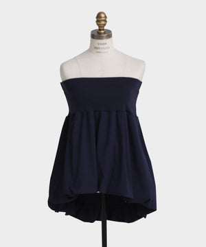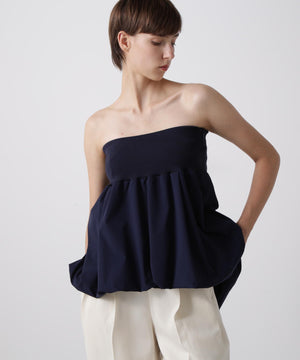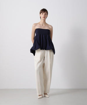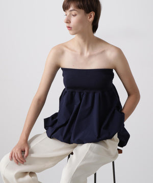 トップ部分にはシルクのような光沢が美しいジアセテートとポリエステル糸のリブ素材を使用。ボトム部分は軽やかなタイプライター生地でバルーンシルエットに仕上げたパーツアイテムです。チューブトップやパンツと合わせて、旬のレイヤードスタイルにトレンド感を添える一枚。華やかさと洗練されたモダンな雰囲気が魅力のアイテムです。