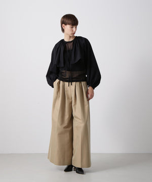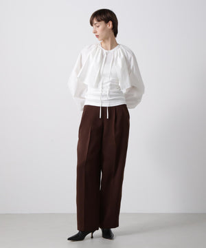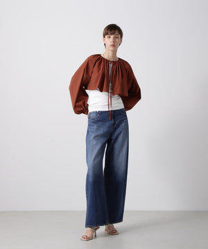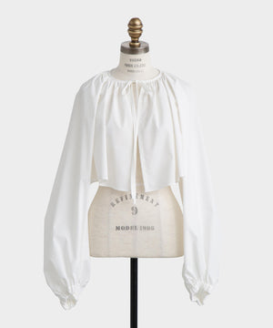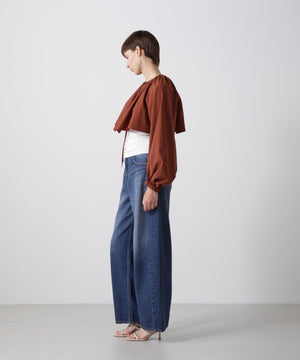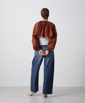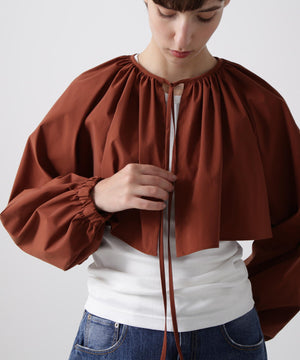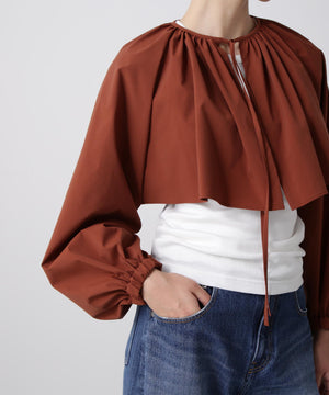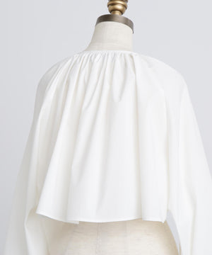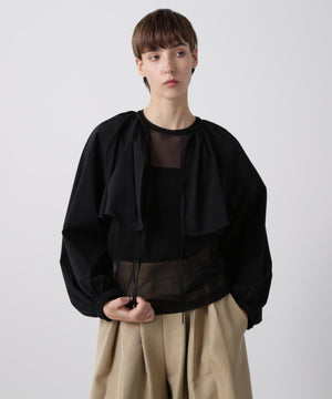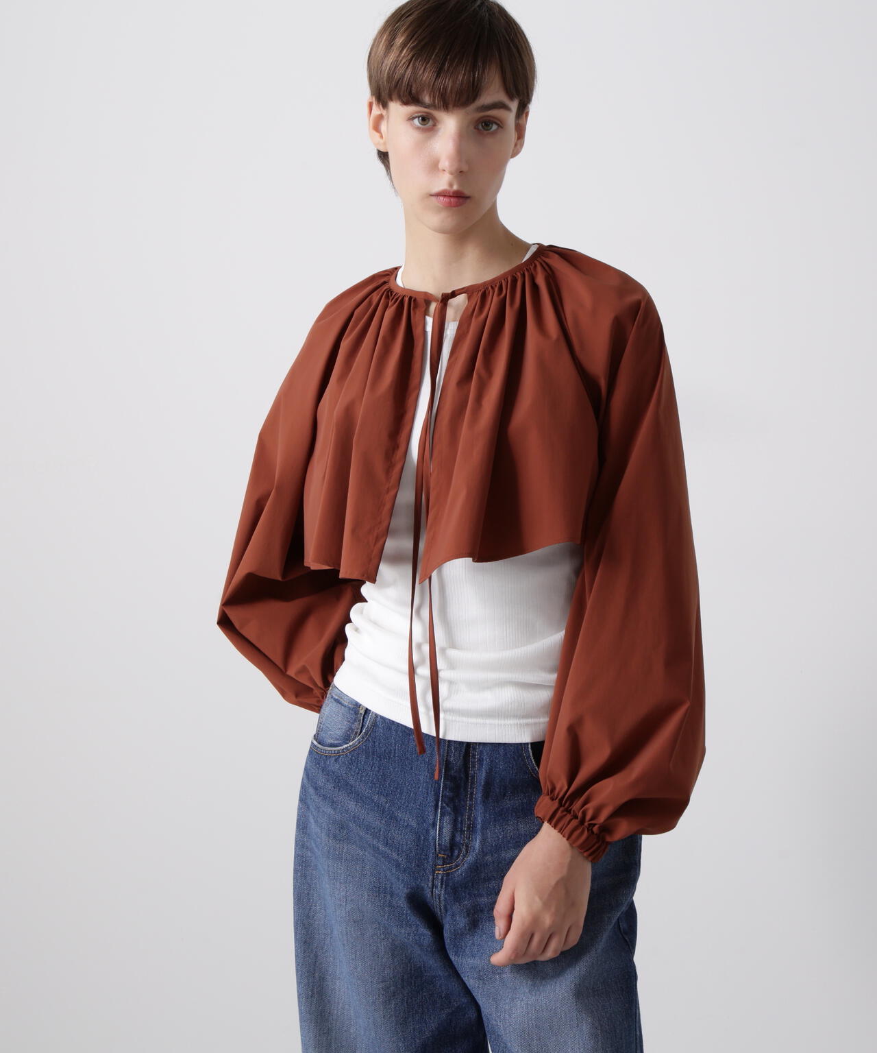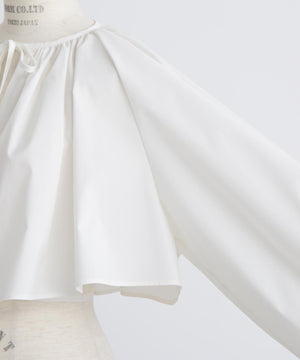 ボリュームスリーブが華やかな印象を添えるクロップトップス。晩夏には半袖として、秋にはタートルネックなどのインナーと重ねてレイヤードスタイルを楽しめるアイテムです。季節の変わり目をスマートに繋ぎ、着こなしに奥行きをプラスします。シワになりにくくお手入れしやすい素材は、タテ糸にフルダルポリエステルタスラン糸、ヨコ糸にストレッチ糸を使用し、快適な着心地も叶えています。