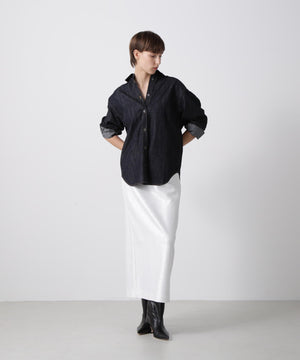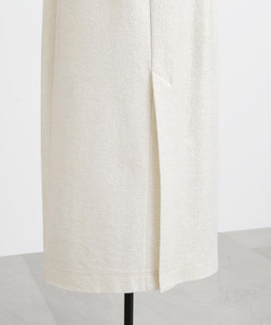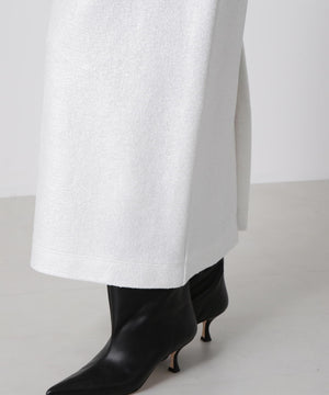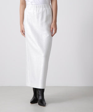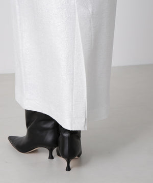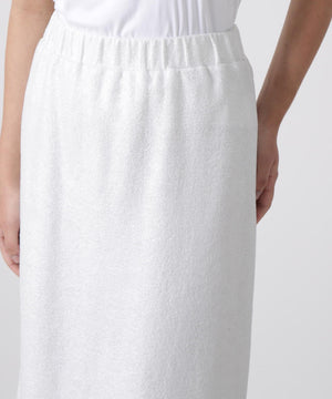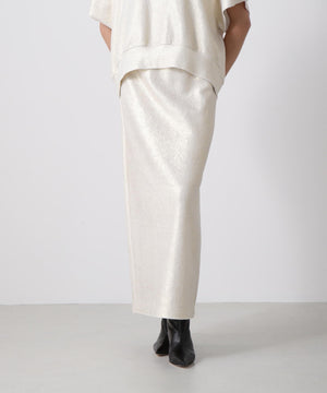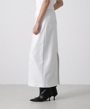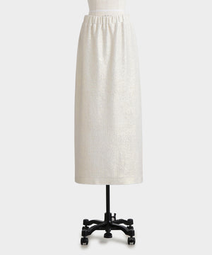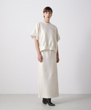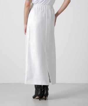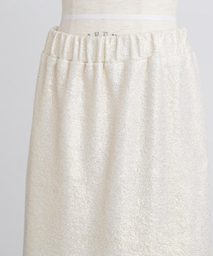 箔プリントの質感を活かしたミニマルなアイラインシルエットスカート。ウエストはゴム仕様で快適なイージーフィットを実現しています。コットンのミニ裏毛パイル面に施された箔プリントが、立体感のある豊かな素材表情を引き立てるデザインです。シンプルながらも存在感のある一枚に仕上げました。