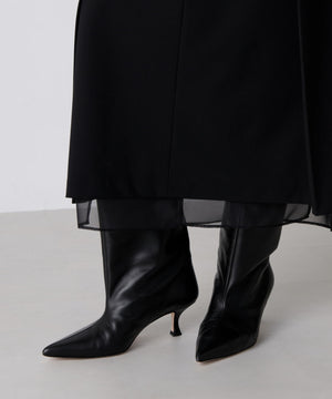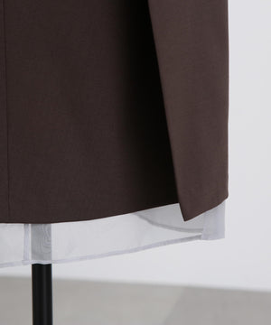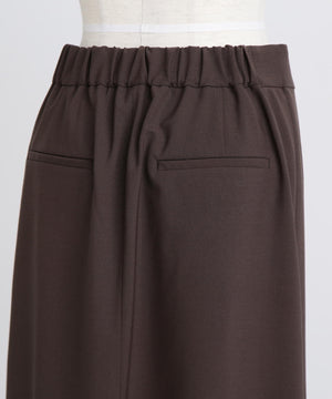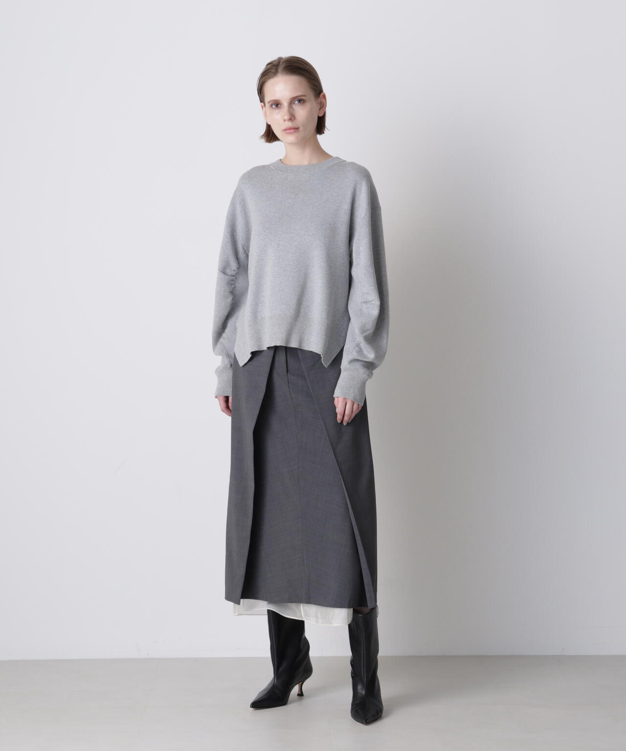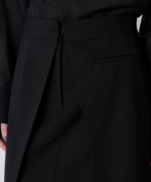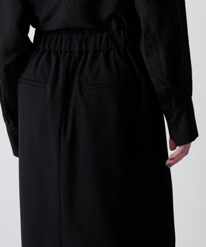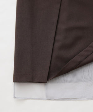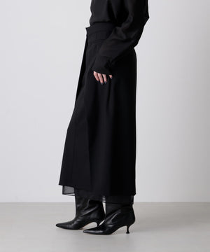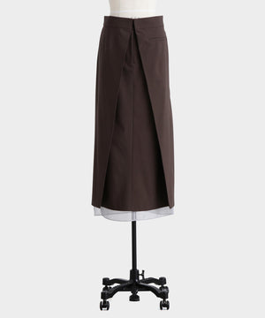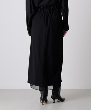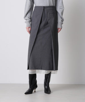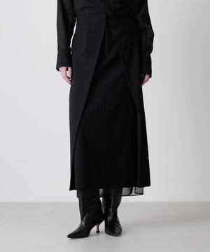 フロントラップデザインが洗練されたミニマルなトラペゾイドスカート。裾から透け感のあるオーガンジーをのぞかせた、繊細でセンシュアルなレイヤード仕立てです。ドライタッチで伸縮性のある2WAYストレッチ梳毛素材を使用し、毛羽立ちにくくさらりとした肌触りで季節を問わず快適に着用できます。