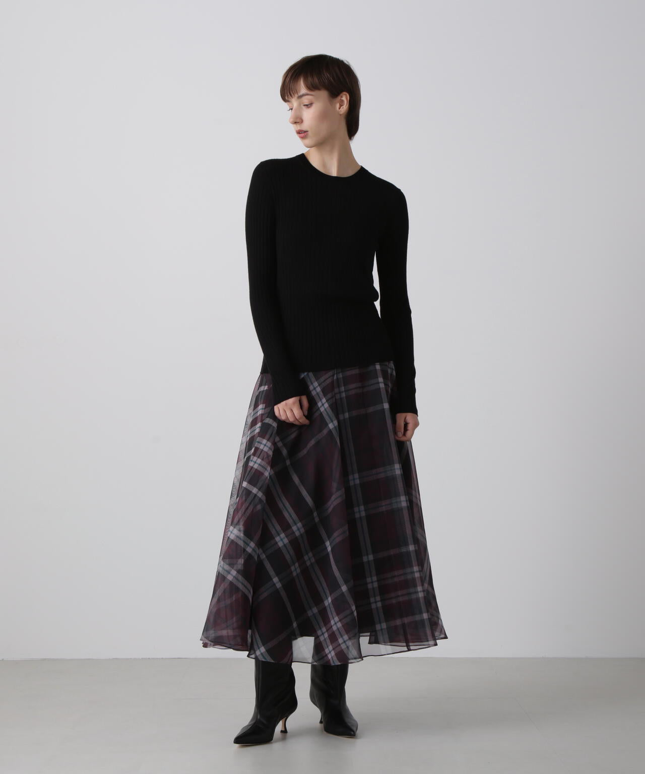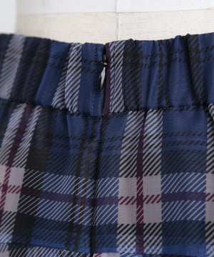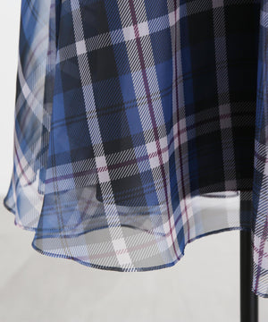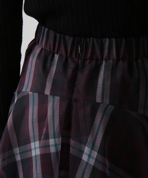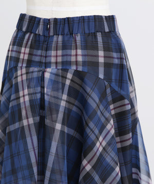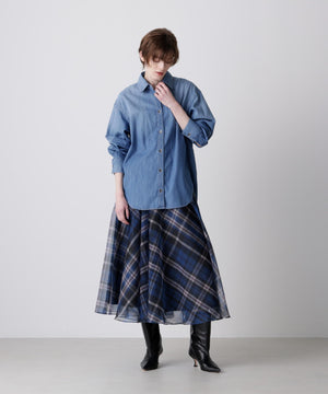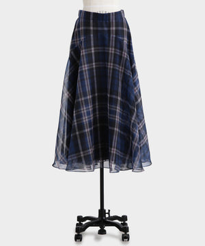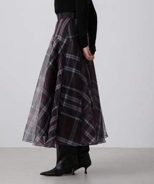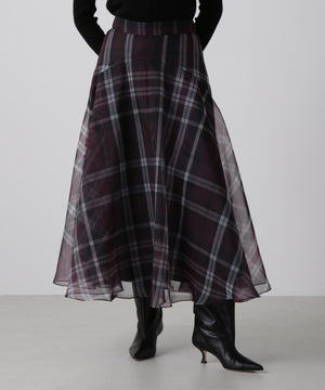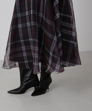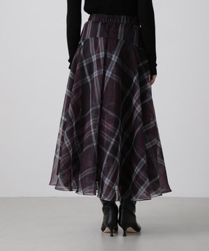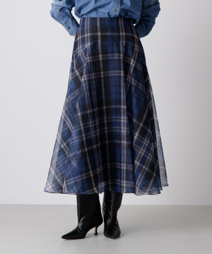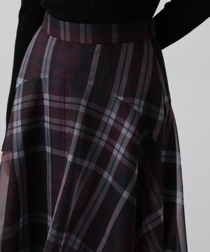 hLMの定番シアーチェックから、今シーズンはクラシックなグレンチェック柄をシアーオーガンジーにのせたドラマティックなフレアスカートが登場。程よいハリ感とマットな質感を持つオーガンジー素材が、シックで洗練された印象を演出します。季節を問わず着回せるシーズンフリーなアイテムで、秋冬は毛足のあるニットとのコーディネートもおすすめ。華やかさとモダンさを兼ね備えた一枚です。