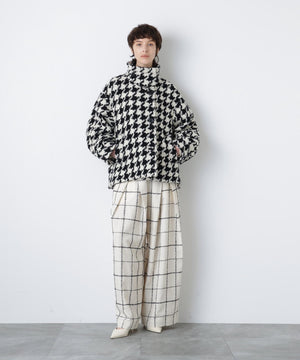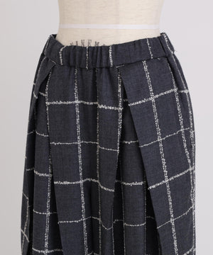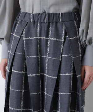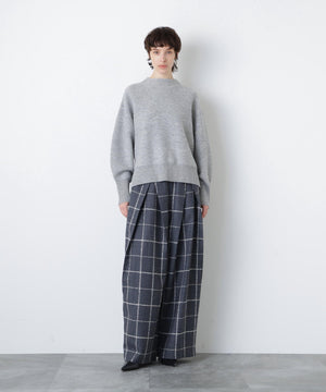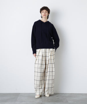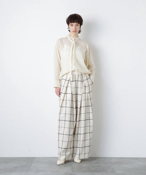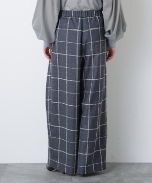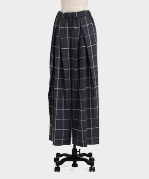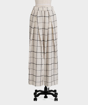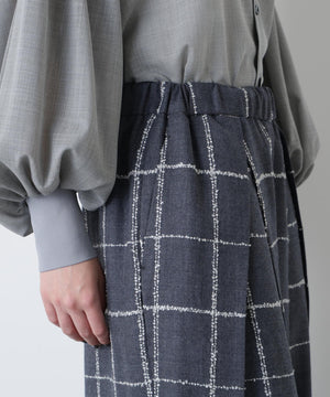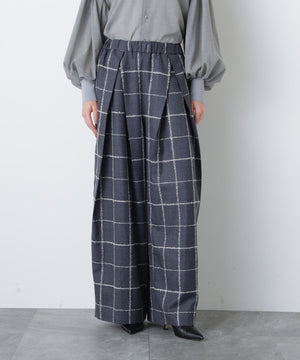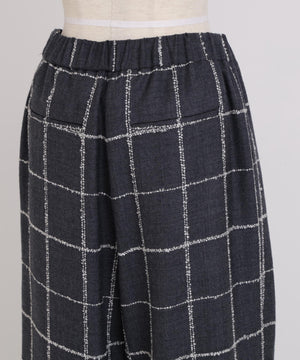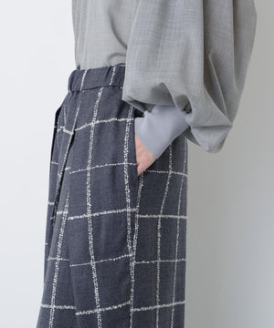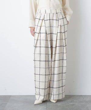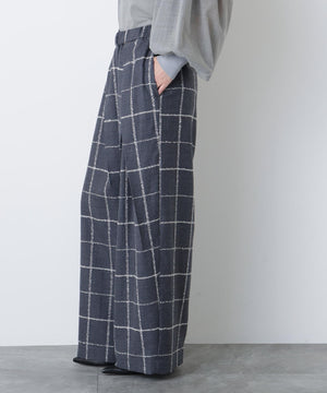 上質な素材感が際立つウールチェックのウエストイージーパンツ。タックを施し、もも周りには程よく分量を持たせ、裾に向かってテーパードしたリラックス感のあるシルエットが特徴です。サキソニーにブークレの糸を使用したウインドーペーンチェックが、さりげなく表情を添え、シンプルなトップスと合わせるだけでスタイリングを引き立てます。ウエストはイージー仕様で快適な着心地を実現し、きちんと感とリラクシーさを兼ね備えた、日常からお出かけまで幅広く活躍する一着です。