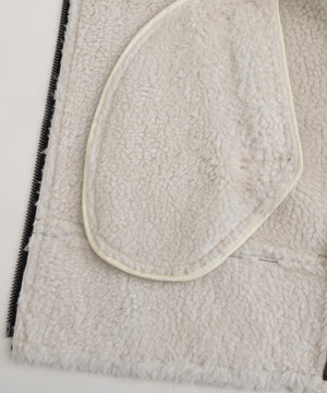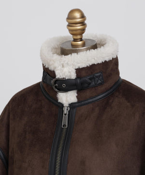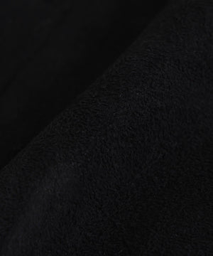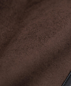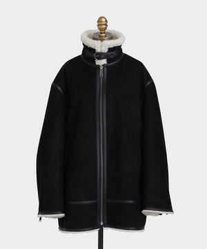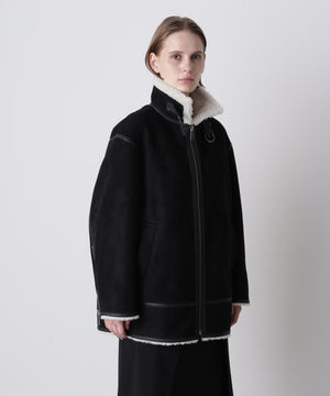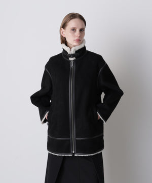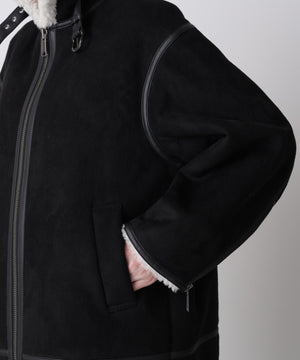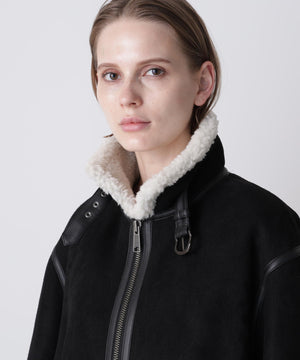 ラグジュアリーな雰囲気漂うエコファージャケット。フランス資本のリアルファーメーカー「ECOPEL」社のエコファーを贅沢に使用し、上質な質感と軽やかな着心地を両立。マットなスエードとボアをボンディングした素材は、リアルムートンのような奥行きある表情を演出。B-3フライトジャケットをベースに、ディテールを削ぎ落とし洗練されたシルエットに。裾のエコスムースレザーパイピングや存在感あるジッパー、襟のチンストラップ、袖口のファスナーなど、細部までこだわりを凝縮したデザインです。