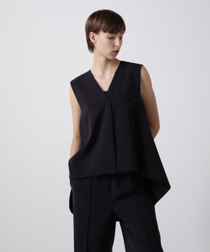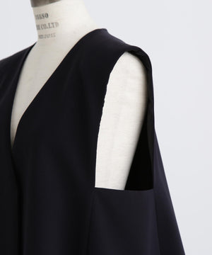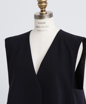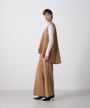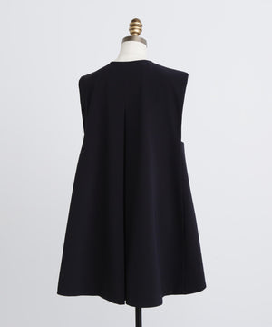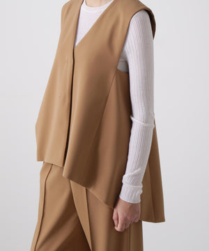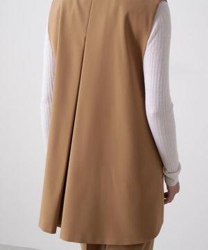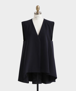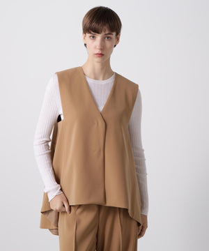バックにボックスタックを施し、ふんわりとしたフレアが華やかな印象を与えるジレ。マニッシュになりがちなジレスタイルに女性らしいエレガントさをプラスしました。柔らかな肌触りと美しいドレープ性が魅力のポリエステル二重織素材を採用し、オン・オフ問わず幅広いシーンで活躍します。