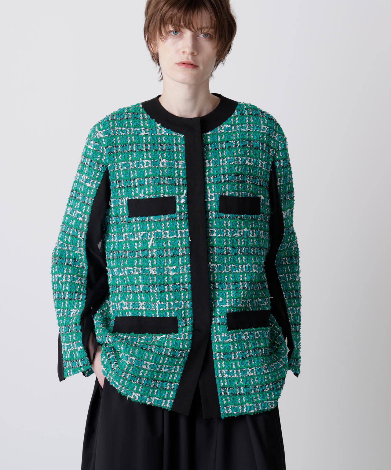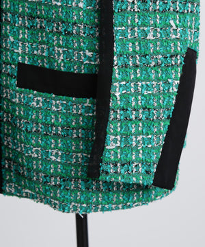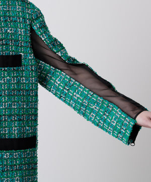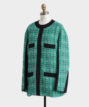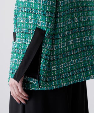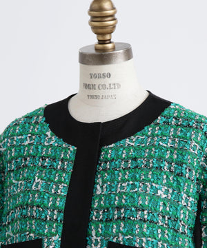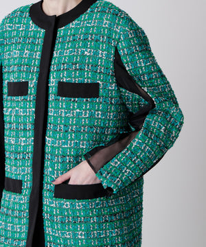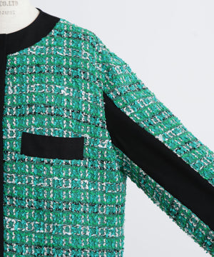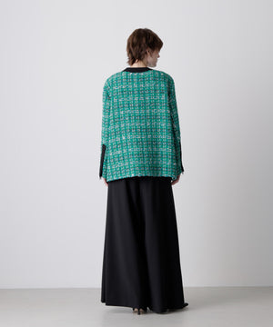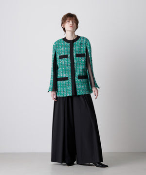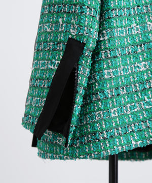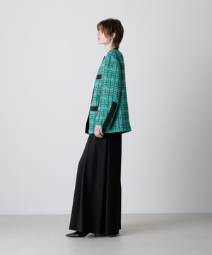 クラシカルなツイード素材を使ったジャケットは、エレガントさと旬のトレンド感を融合したゆったりとしたオーバーシルエットが魅力。表情豊かなツイード生地に、ブラックのグログランテープをアクセントとして効かせ、モダンな印象をプラスしました。使用しているツイードは、イングランド北端のカーライルにてWilliam Linton氏が創業したLINTON社の特別なファンシーツイード。世界的に著名なトップデザイナー、特にココ・シャネルが愛用したことで知られ、その独特な質感と美しさが多くのファンを魅了しています。
