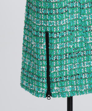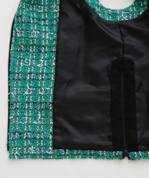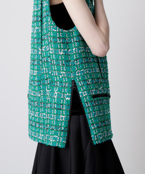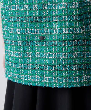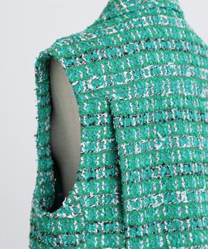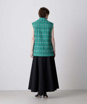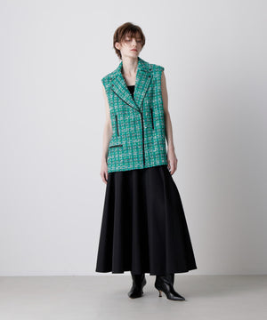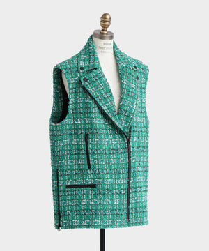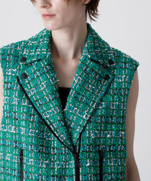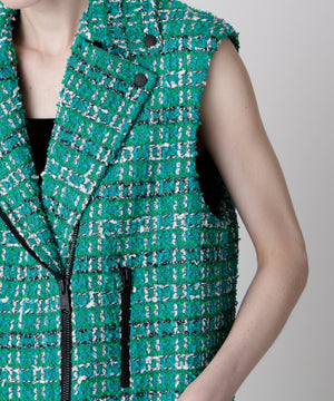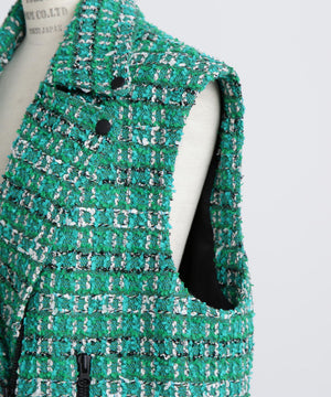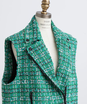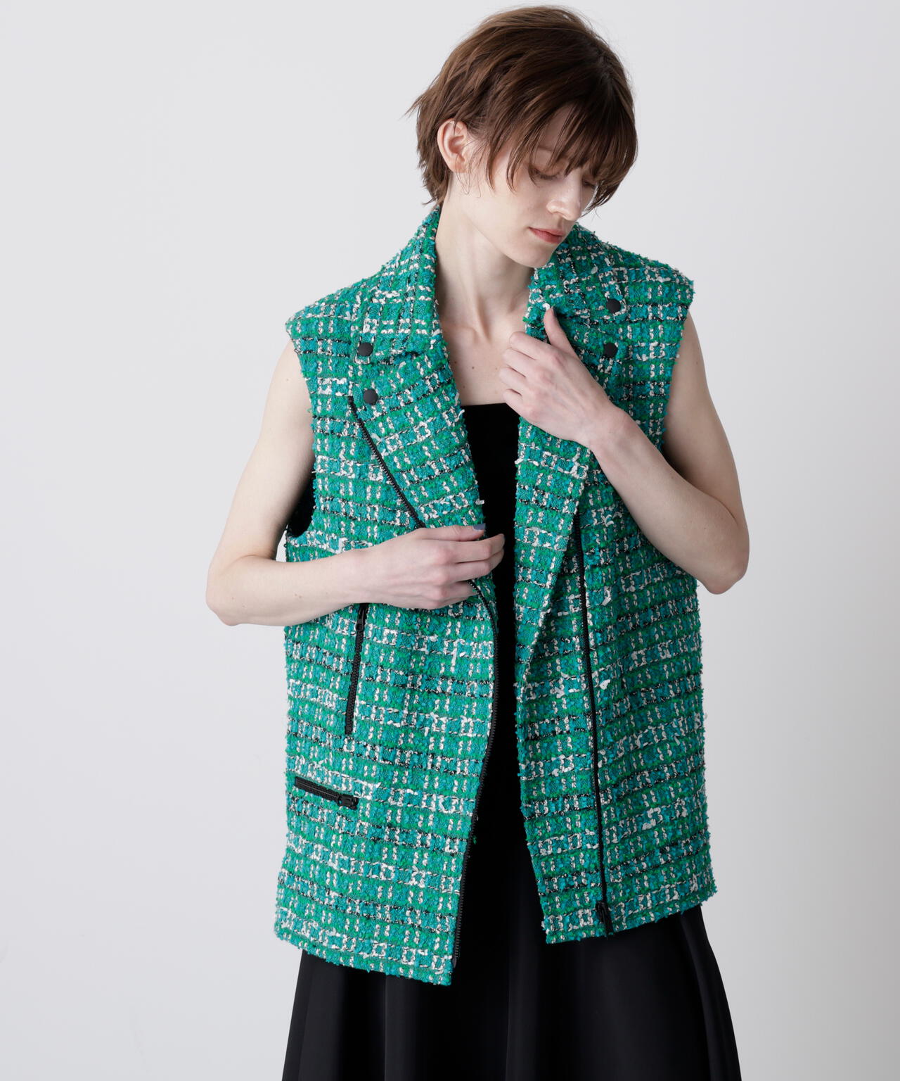 オーバーサイズのライダースデザインにクラシックなツイードをあしらったジレジャケット。エレガントな着こなしにアクセントを添えるほか、カジュアルなデニムとの組み合わせもおすすめです。使用素材は、イングランド北端カーライルでWilliam Linton氏が創業したLINTON(リントン)社のファンシーツイード。独特の風合いが魅力で、世界のトップデザイナー、特にココ・シャネルが愛用したことで知られる名門ブランドの生地を採用しています。