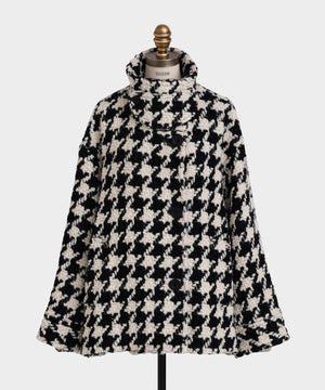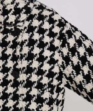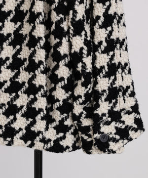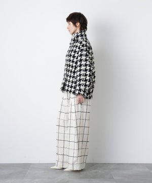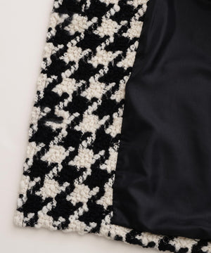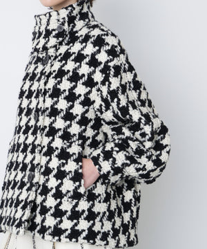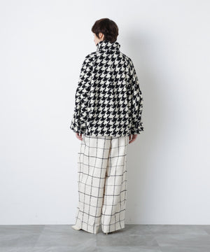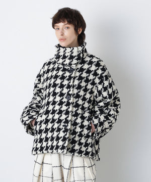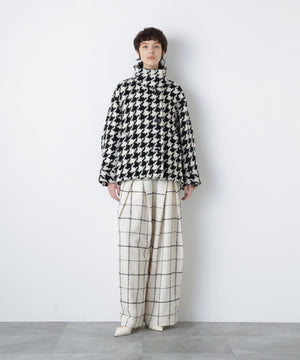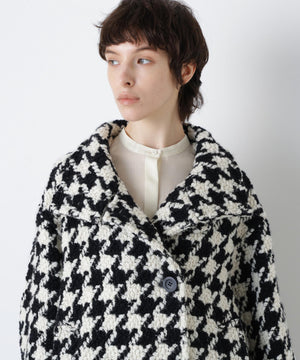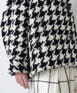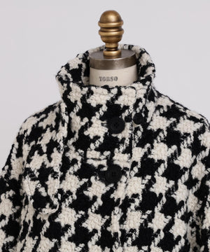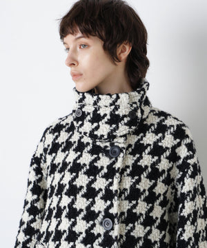 印象的なビッグハウンドトゥース柄が目を引くショートコート。国内で丁寧に織り上げたオリジナル素材を使用し、ボリュームのあるスリーブや高めのスタンドカラーを取り入れつつも、気負わずに着られるリラクシーな仕上がりです。クラシックなデザインをコンテンポラリーなシルエットに昇華し、着こなしの主役として存在感を放つ一着。今シーズンらしい旬の雰囲気を纏いながら、上品さとモード感を兼ね備えた、幅広いスタイリングに活躍するコートです。