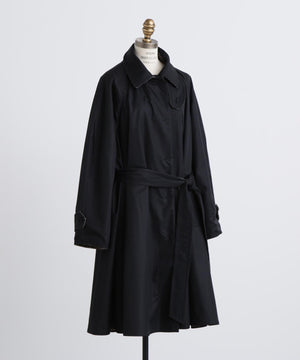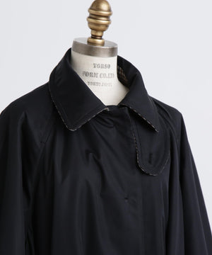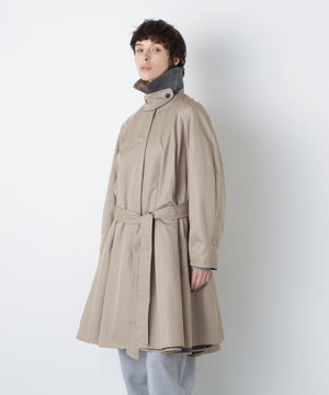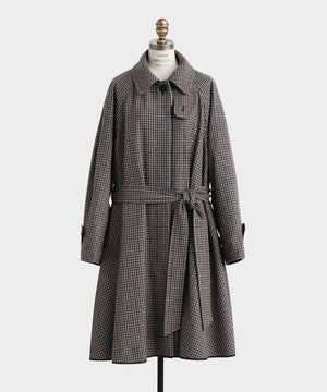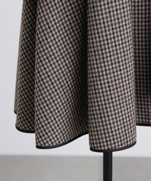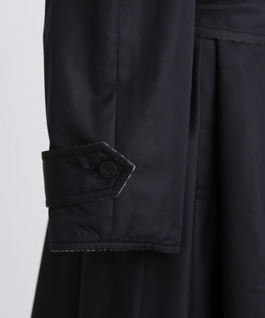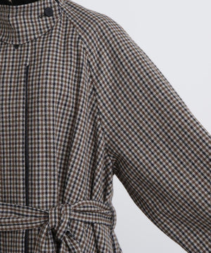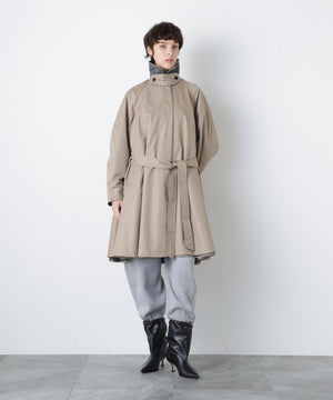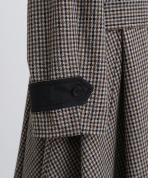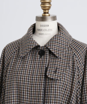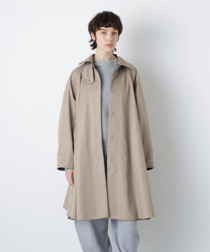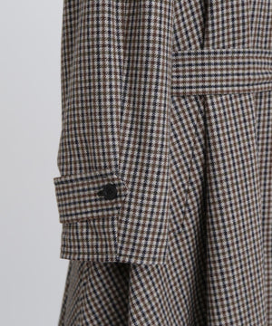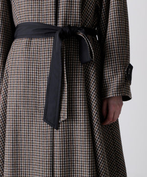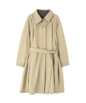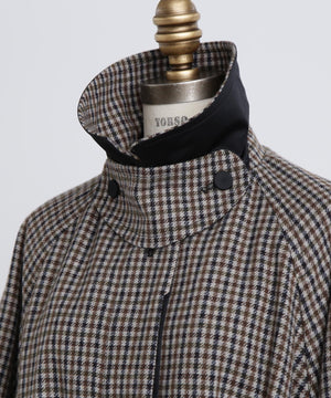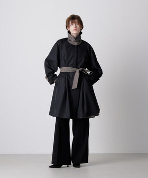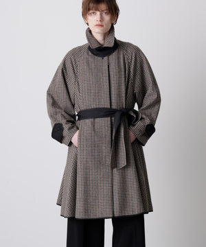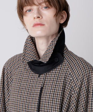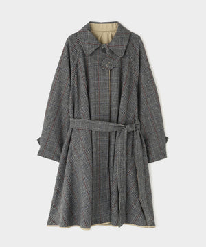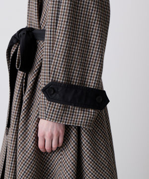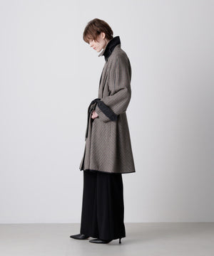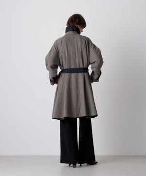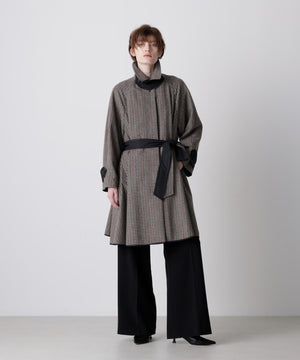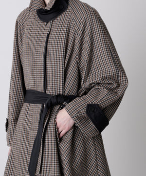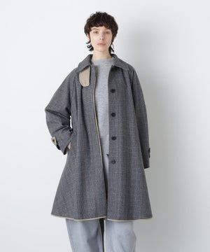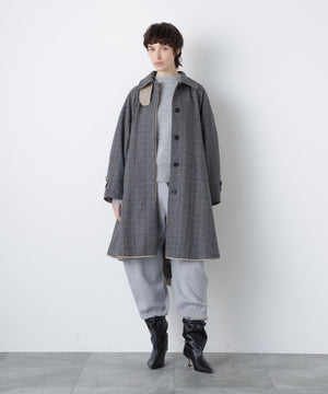 リバーシブルで楽しめるバルマカーンコート。クラシカルなムードを纏いながらも、サーキュラースカートのように贅沢にフレアを入れたテントラインシルエットが動くたびに美しい表情を生み出し、羽織るだけで存在感を放ちます。表面は上質なウール混チェック、裏面は軽やかなポリエステル素材で仕立て、気分やシーンに合わせて表情を変えられるのが魅力。裾には裏地をパイピングし、細部までこだわった配色アクセントを添えました。