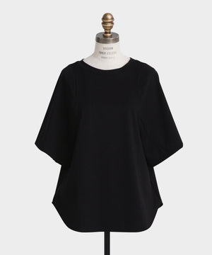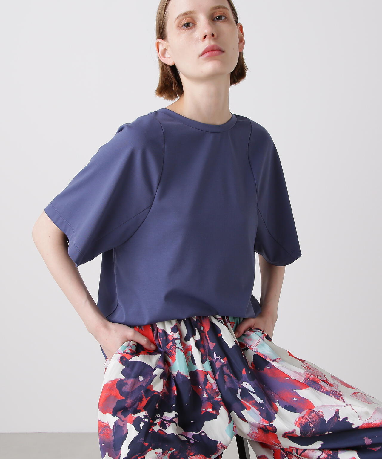 フレアスリーブの軽やかさと、ラグラン風に内へ入った袖のラインが織りなす、さりげない構築美。