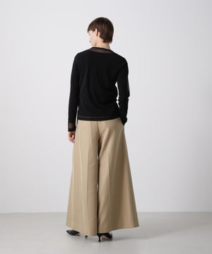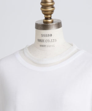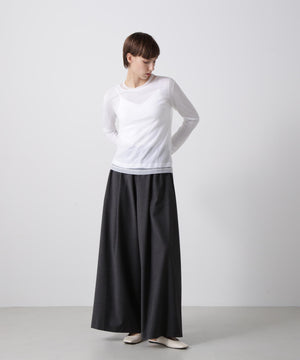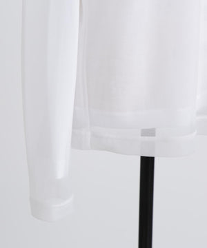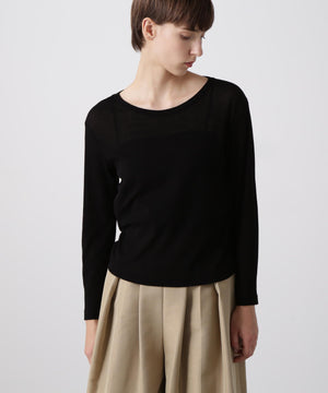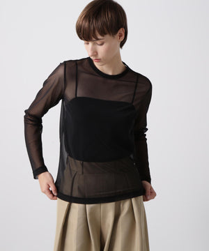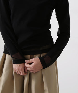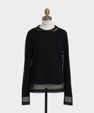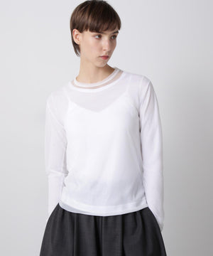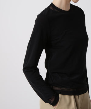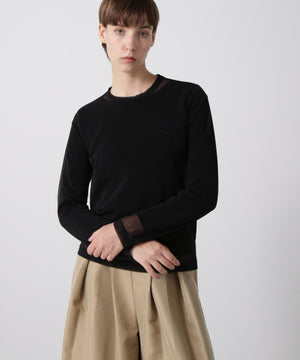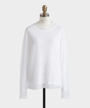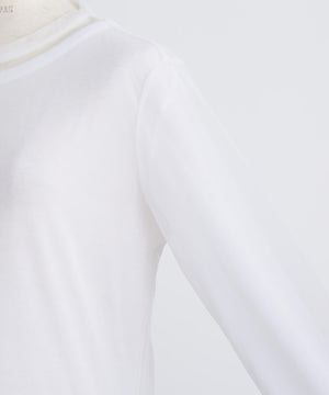 シアーなポリエステル素材のアウターと、ハイゲージコットンのインナーを重ねたレイヤードロングスリーブTシャツ。裾や袖口から透け感のあるシアー素材がさりげなくのぞくデザインが、さりげない華やかさを演出します。1枚での着用はもちろん、ジャケットのインナーとしても合わせやすく、多彩なコーディネートに活躍する一着です。