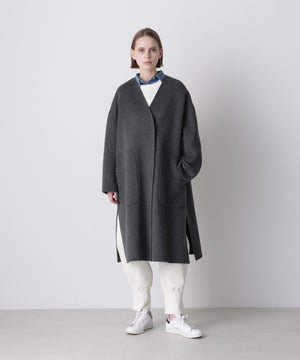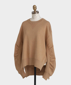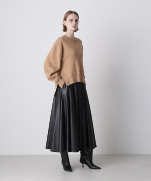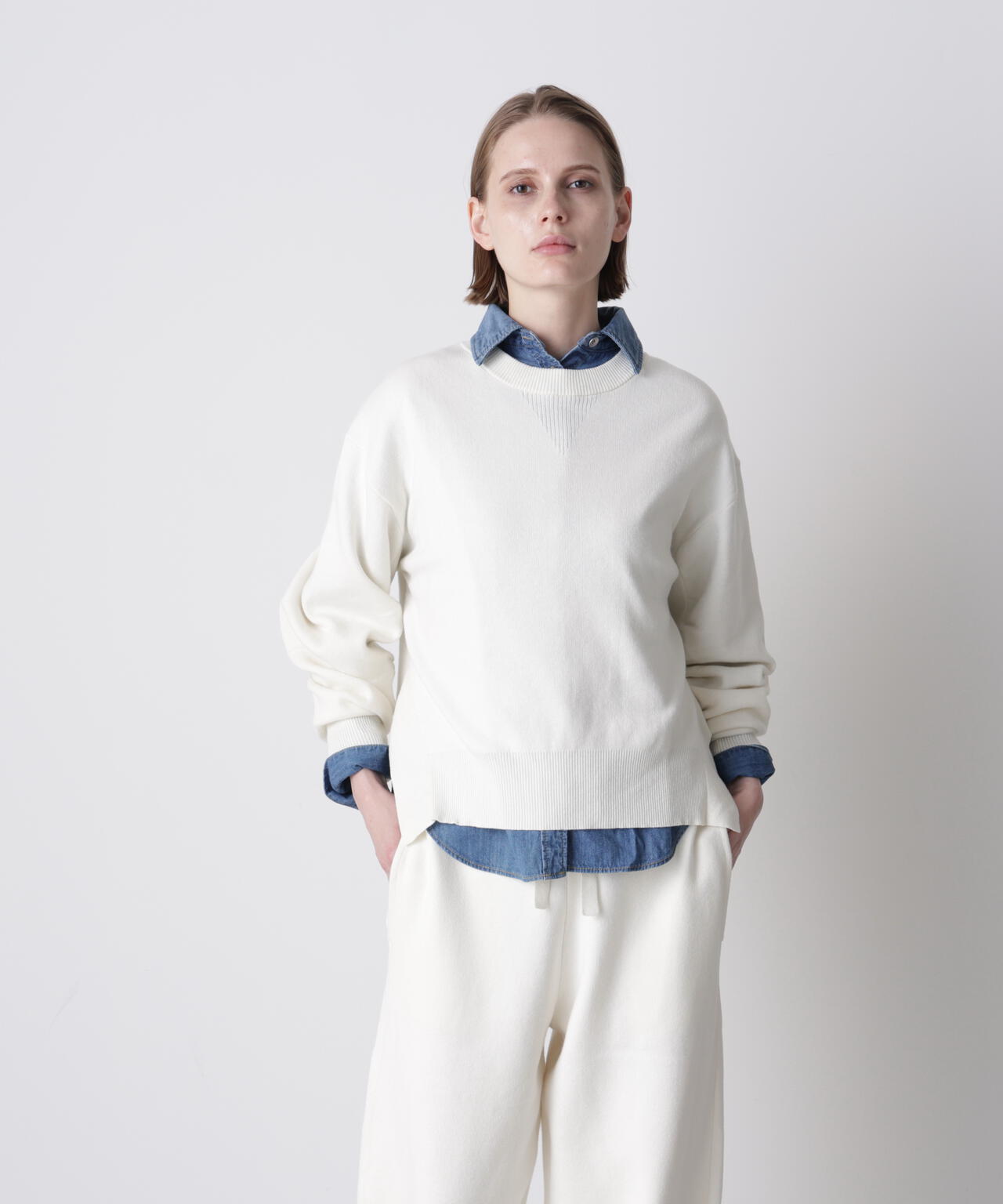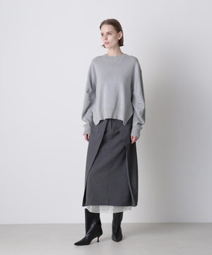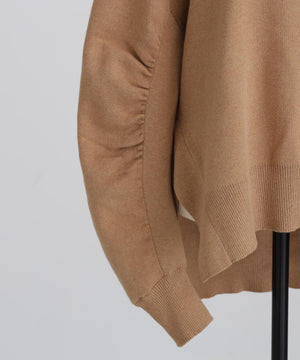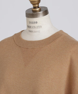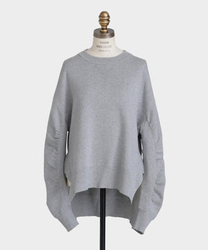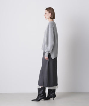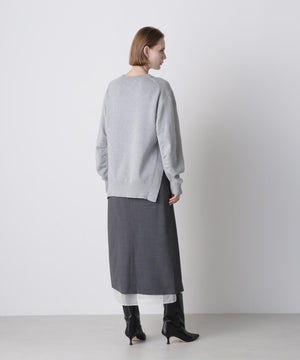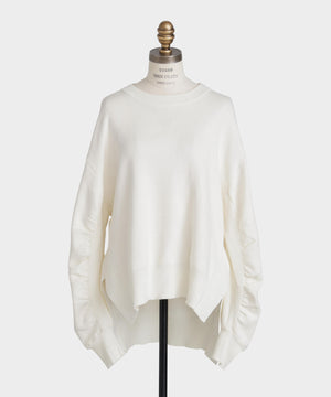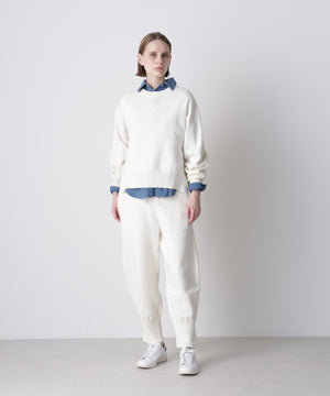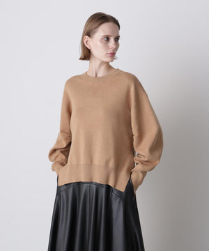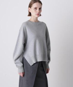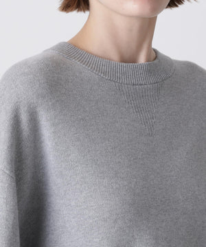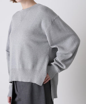上質な素材感が魅力のスウェット風プルオーバー。カジュアルになりがちなスエットを、カシミヤブレンドのコットンを使用したダブルフェイス編みで仕上げることで、柔らかさと膨らみのある上品な表情を実現しました。フロントにはガゼットデザインのリブを配し、袖の内側もリブで切り替えることで、細部まで丁寧にデザイン。サイドスリットを施すことで、ボトムスとのレイヤードも美しく、全体のスタイリングバランスが取りやすい仕上がりです。シンプルながらも着こなしに洗練された印象を添える一着です。