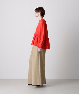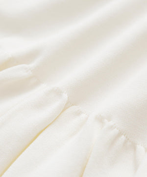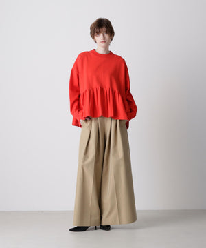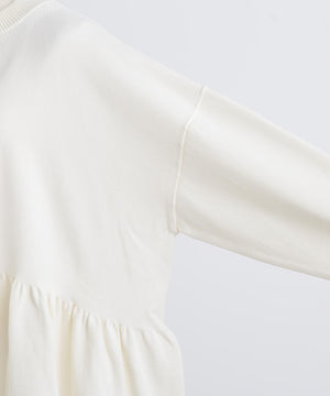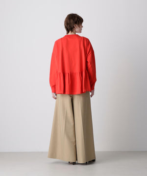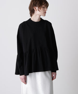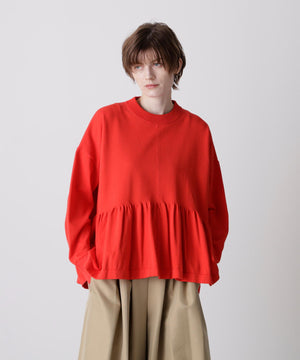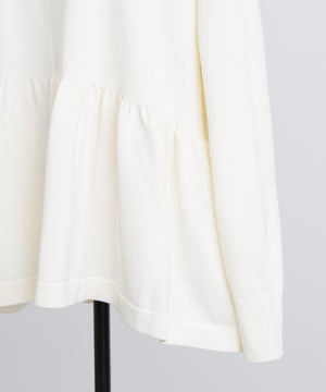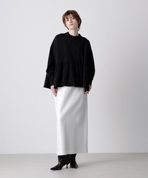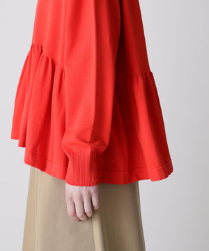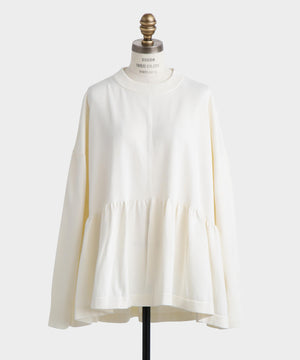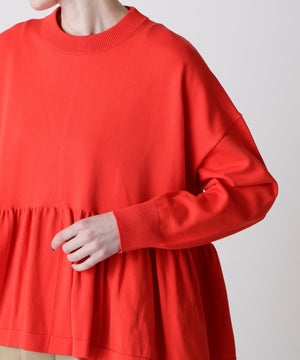 軽やかなポリエステル100%の表面に、肌触りの良いコットン100%の内側を組み合わせたニットトップス。ウエストから続く特殊な編み方で目を増やし、自然なギャザーを生み出したペプラムデザインが魅力です。リラクシーなシルエットながら甘さを抑え、洗練されたトレンド感を演出する一枚に仕上がっています。