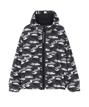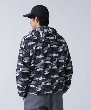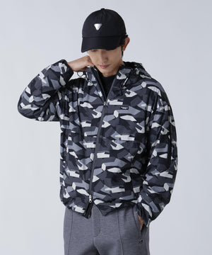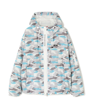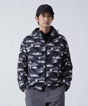 ロゴやチェック柄を組み合わせた今季のグラフィックでインパクトたっぷりに仕上げた、迷彩プリントフーディブルゾン。