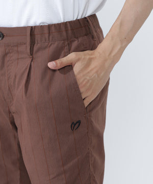 楽にはけて動きやすいゴムウエスト配置と、ワンタックを施して腰まわりにゆとりを与えた作りです。