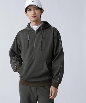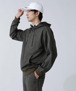 パイピングの袖ラインでスポーティーなアクセントを効かせた、幾何学柄ジャガードフーディプルオーバー。