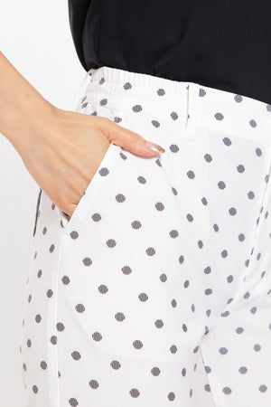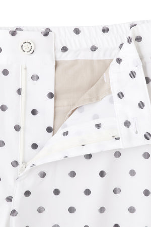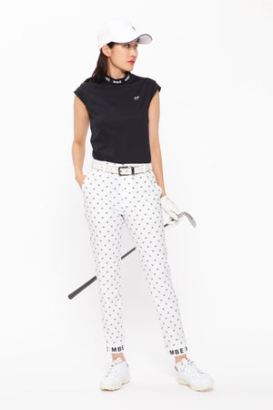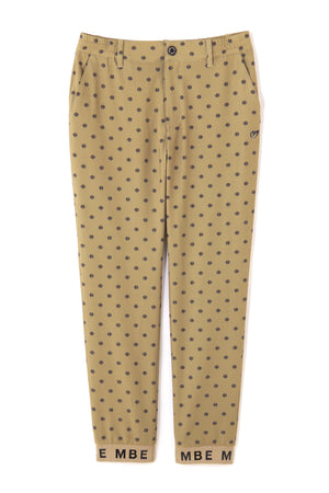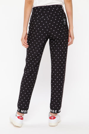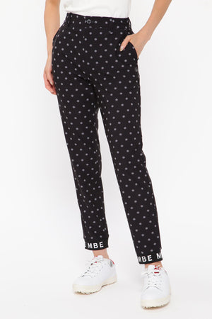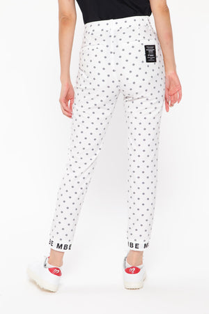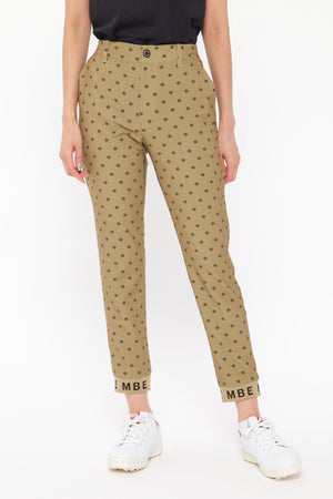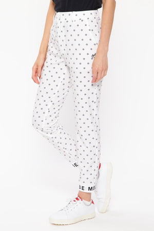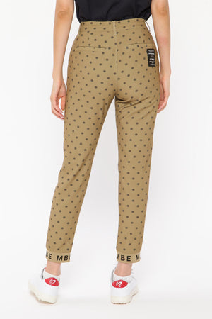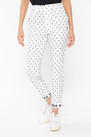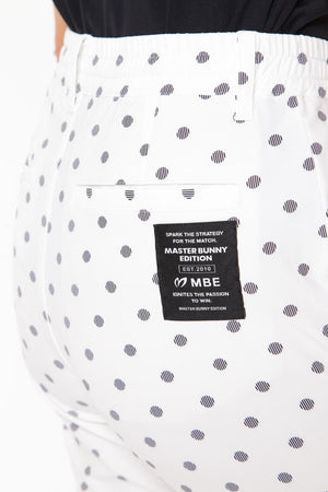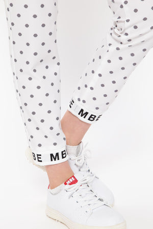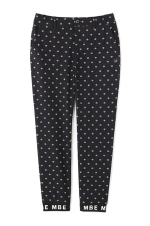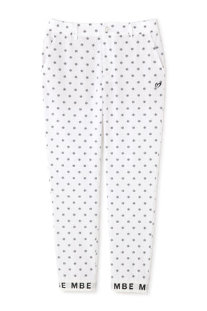 ドットモチーフのトレンド感のあるパンツをスポーティーに仕上げた、ドット柄のジョガーパンツ。ストライプを取り入れた変形ドット柄で、可愛らしさと遊び心を落とし込んでいます。足首を細く見せて着こなしに抜け感をプラスできる、MBEロゴの裾リブがアクセントになっています。身体の動きを邪魔しないストレッチの効いた生地感と、はいた時に美しいシルエットが出る履き心地の良さも魅力です。一日中着用してもシワ感も気にならず、ゴムウエストならではのリラックス感で、涼しく過ごせる、この夏オススメのアイテムです。