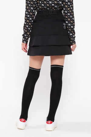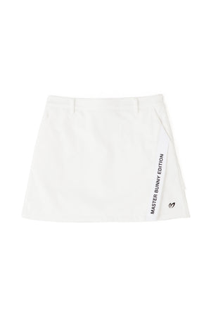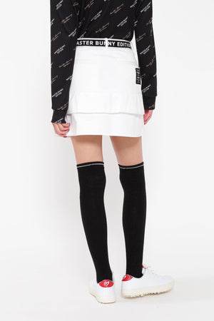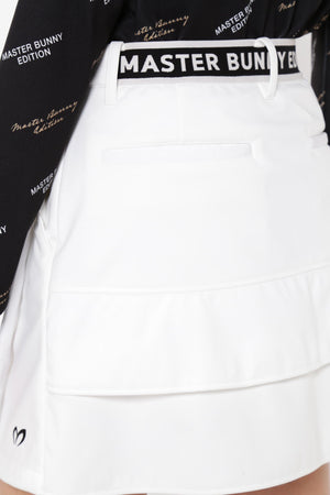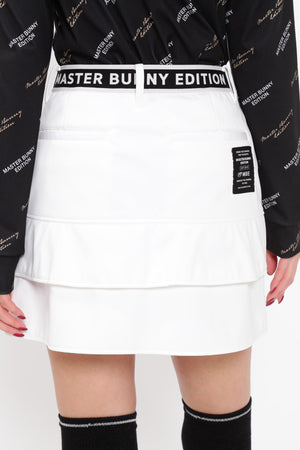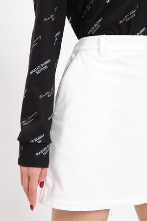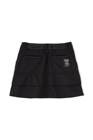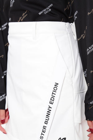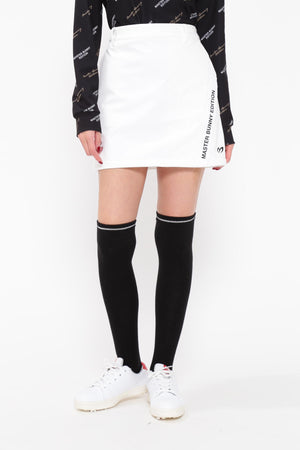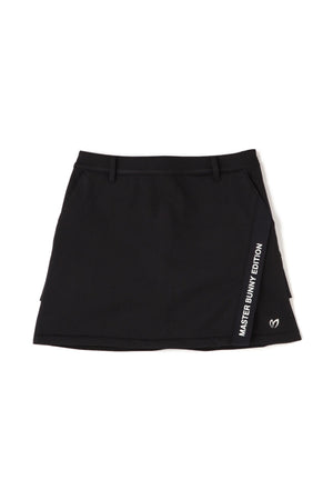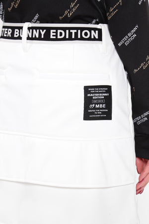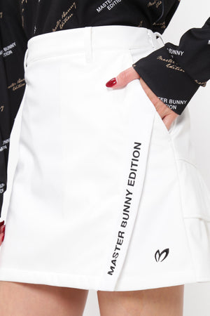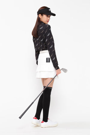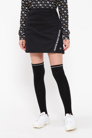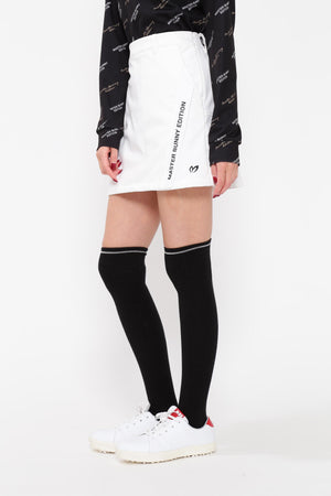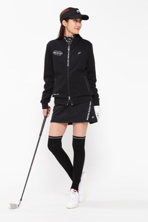 MBEロゴをあしらったラップ調のディテールで足捌きを快適にした、ニットボンディングスカート。後ろ身頃の裾のペプラムで、広がりすぎない美しいフレアーラインを表現したオシャレに防寒対策できるアイテム。伸縮性の良い薄手ニットの表側と、 足を入れた瞬間から温かさが感じられる起毛加工をしたフリースニットを裏側に採用したボンディング素材を使用。撥水効果のあるポリウレタンフィルムを使用することで、冷たい風をシャットアウトしてくれる防風性も兼ね備えた保温性を高めた作りです。一点合わせるだけで、冬場のゴルフコーデを華やかにしてくれるアイテムです。