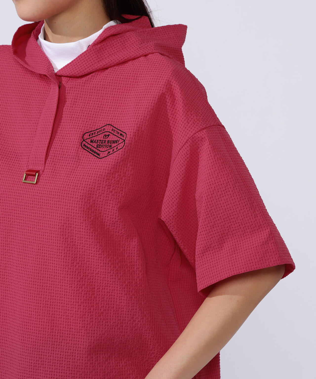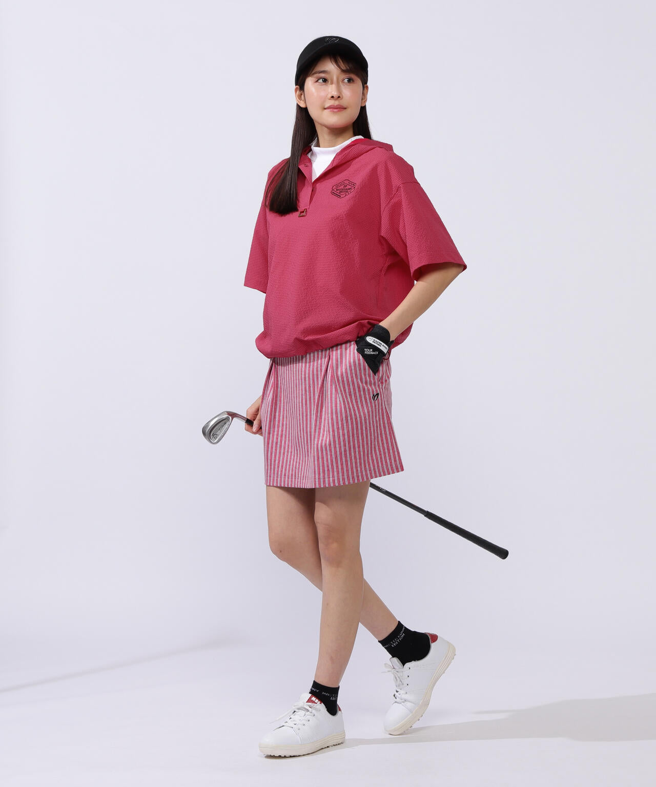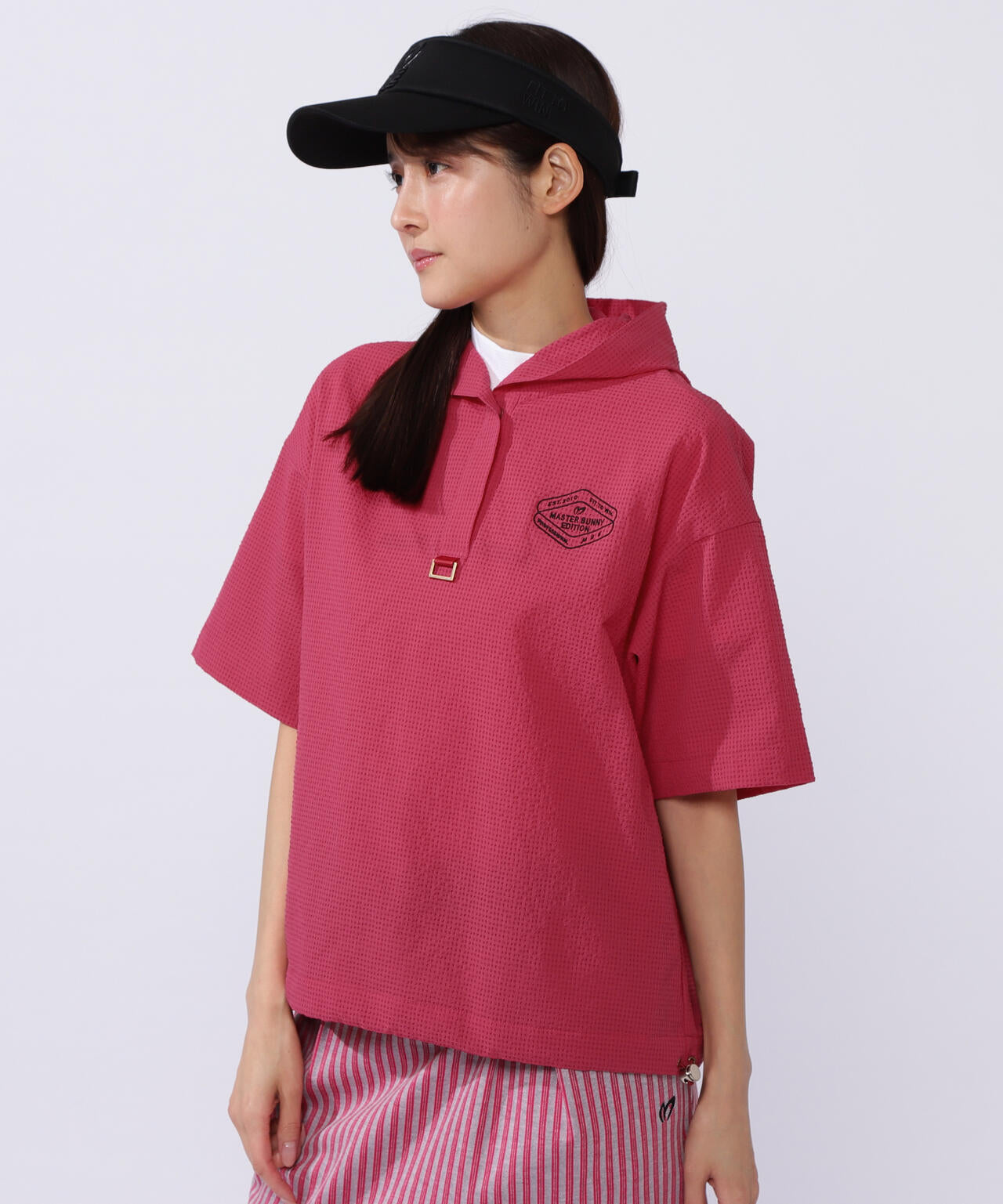 洗練されたイメージでスタイリングの鮮度アップにも重宝する、サッカーストレッチ半袖フーディプルオーバー。ストレッチ性、形態安定性に優れてたバネ状の分子構造により、身体の動きに合わせて伸縮して快適な着心地を実現するタフな高伸縮機能糸のTEXBRIDを採用。また、凹凸がある通気性の高さが魅力のサッカー生地を使用して、汗をかいてもムレを軽減した肌離れが良いサラッとした風合いを保ちます。裾にドローコードを入れてシルエットのアレンジを楽しむこともできる、着膨れしないゆったりとしたシルエットで作られています。合わせるアイテム次第で様々なスタイリングを楽しめる、ゴルフ練習場などのゴルフシーンに限らず、アウトドアで、デイリーユースで大活躍する逸品です。同素材でご用意のある、スカートとのセットアップコーデもおすすめです。