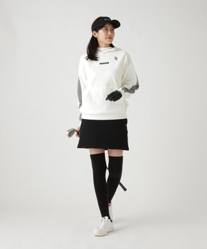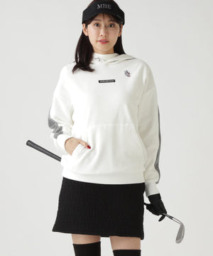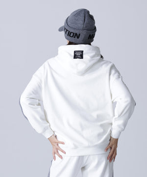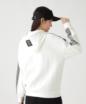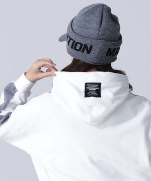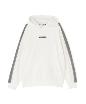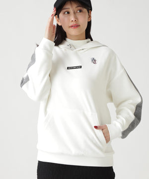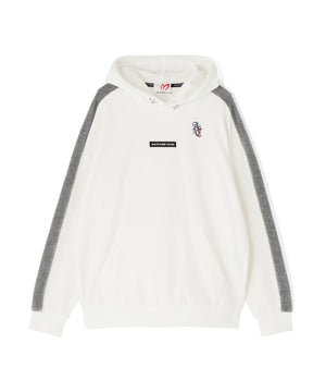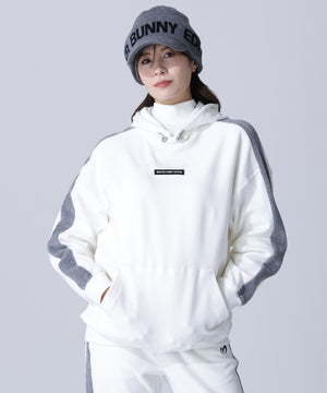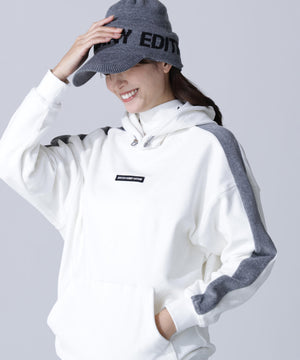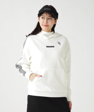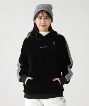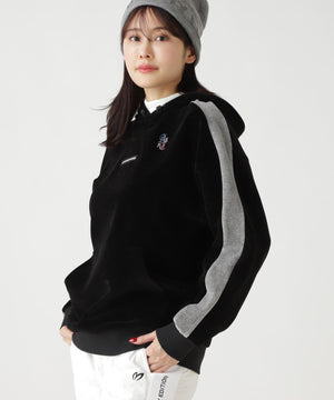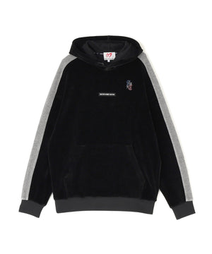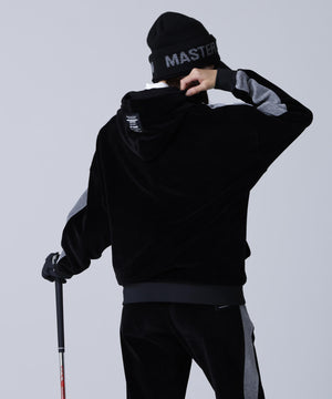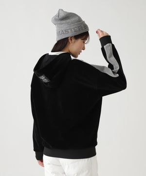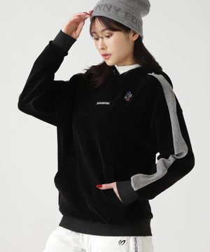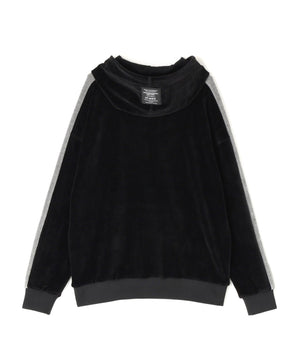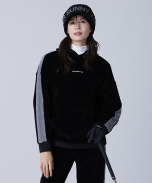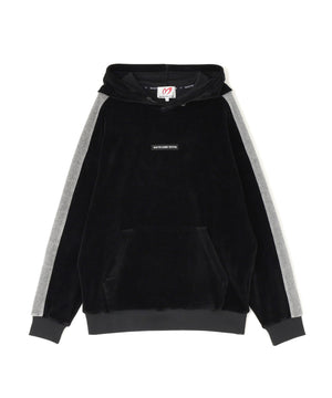 バイカラーの切替しで袖にデザイン性を与えた、ベロアフーディプルオーバー。
