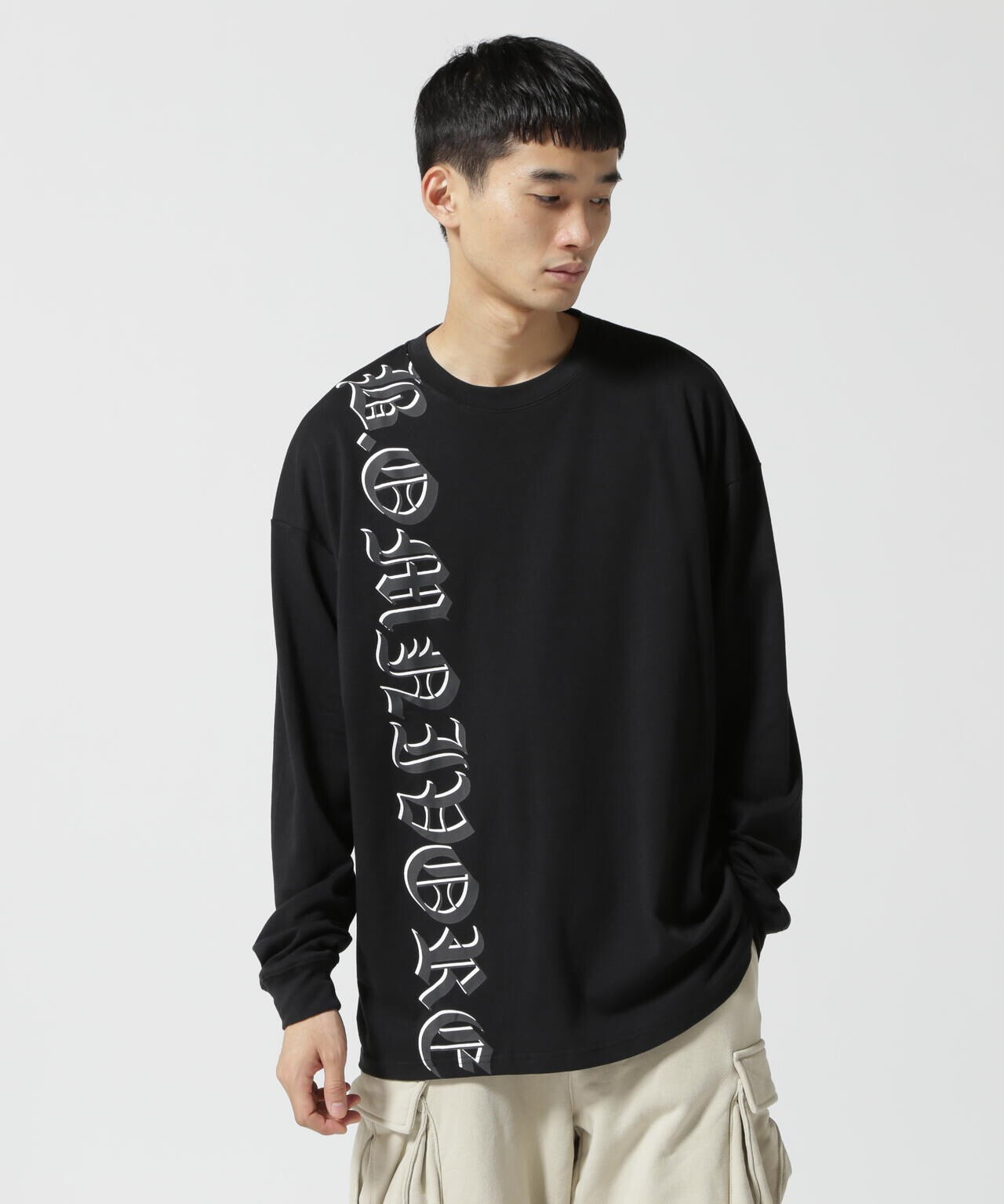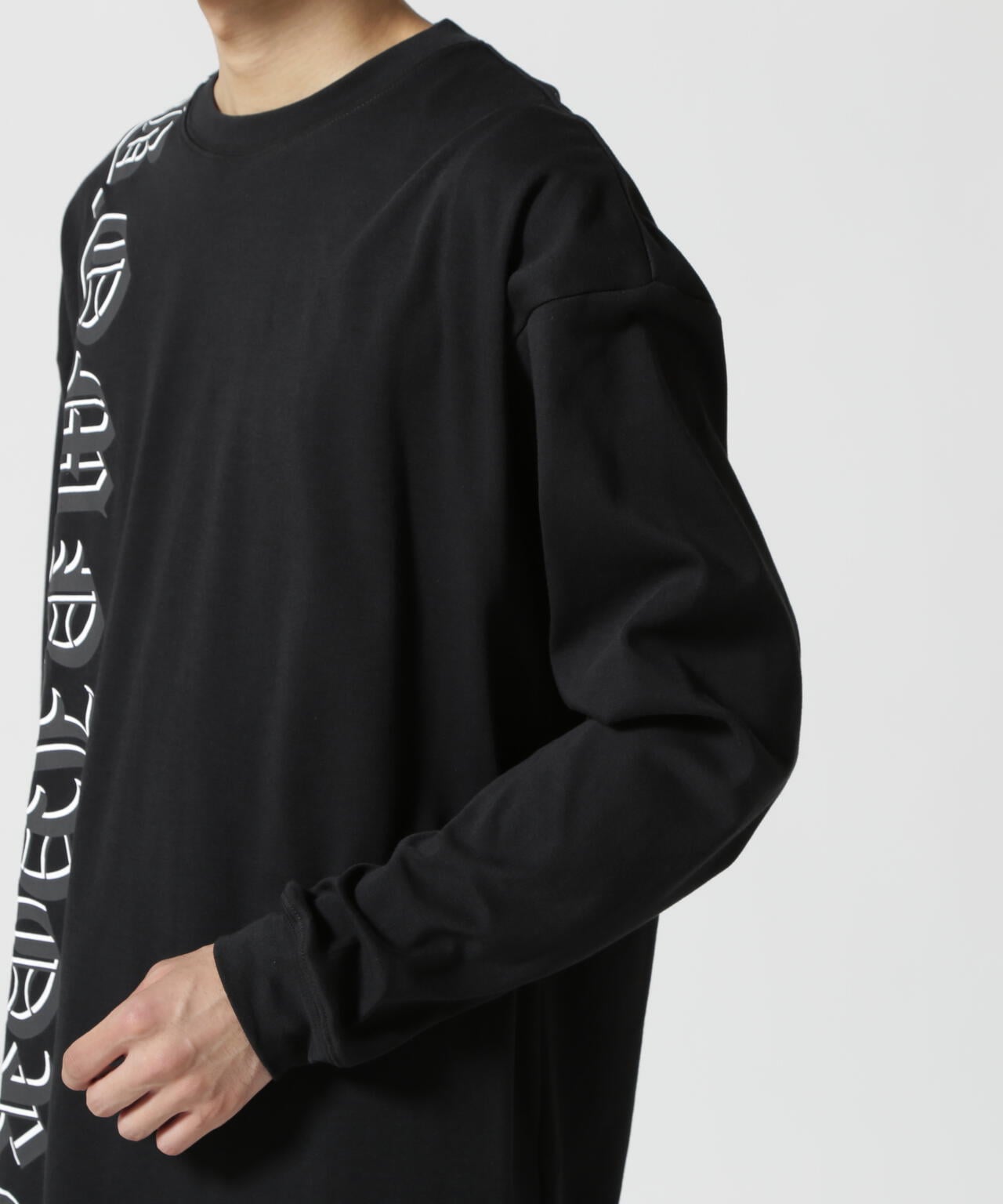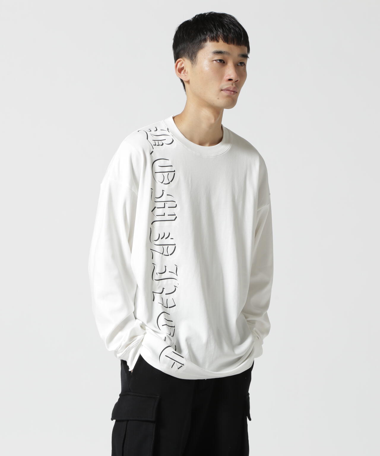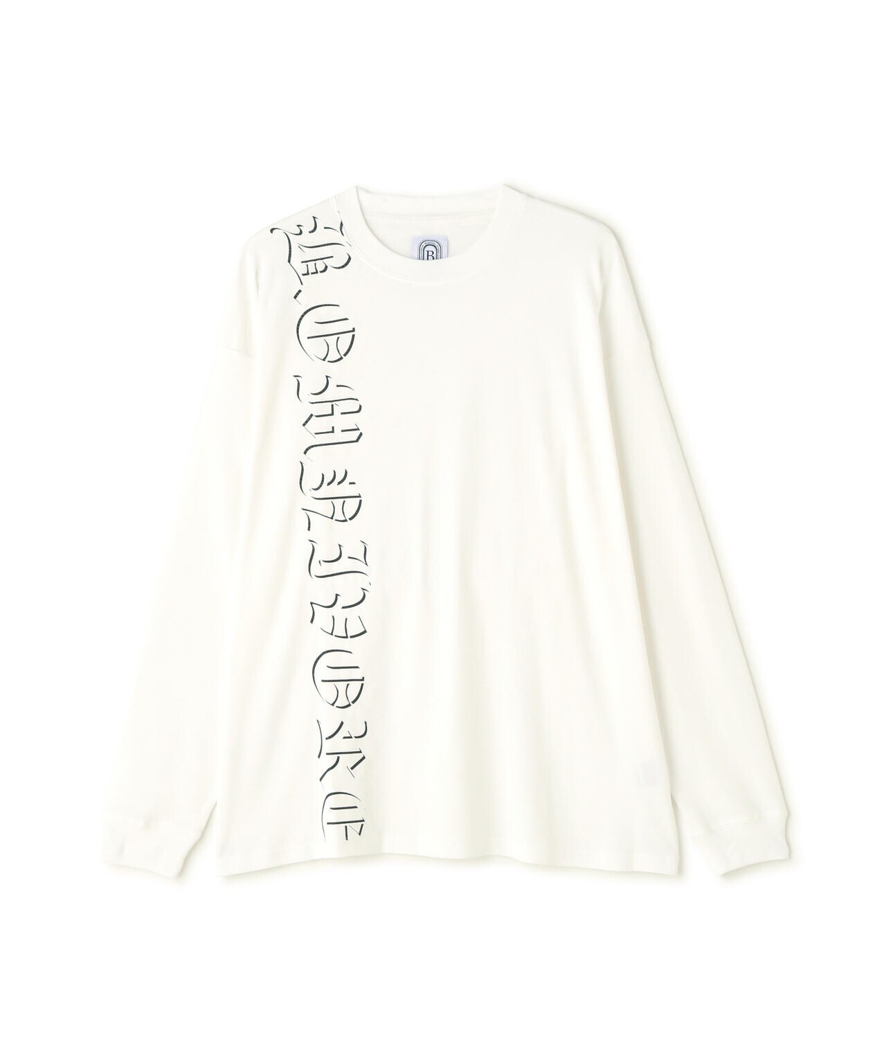 肩口から裾まで入った独特のプリント文字が特徴的なロングスリーブTシャツ
