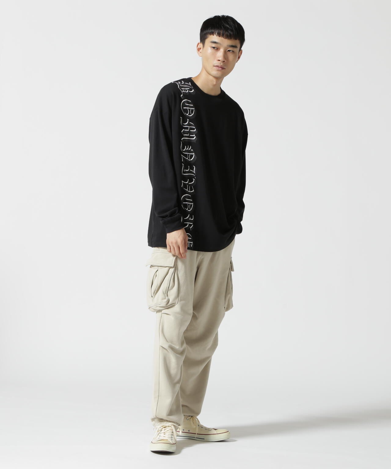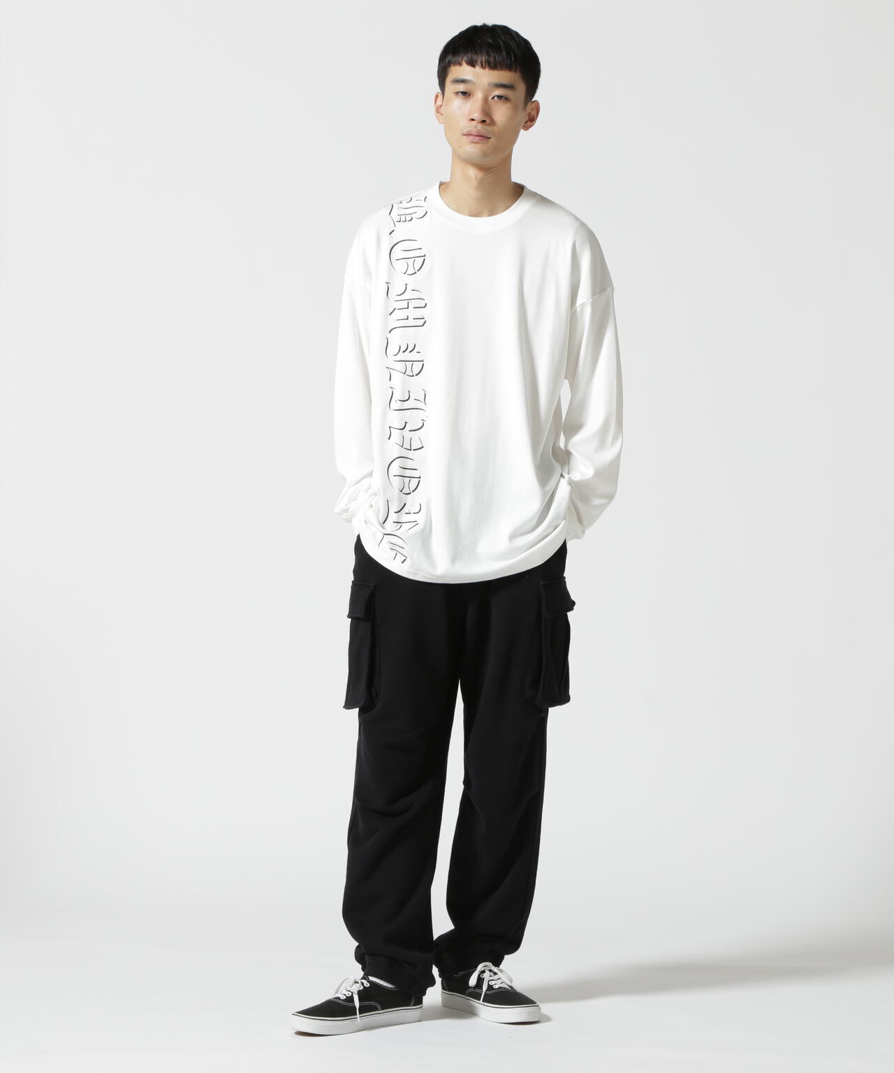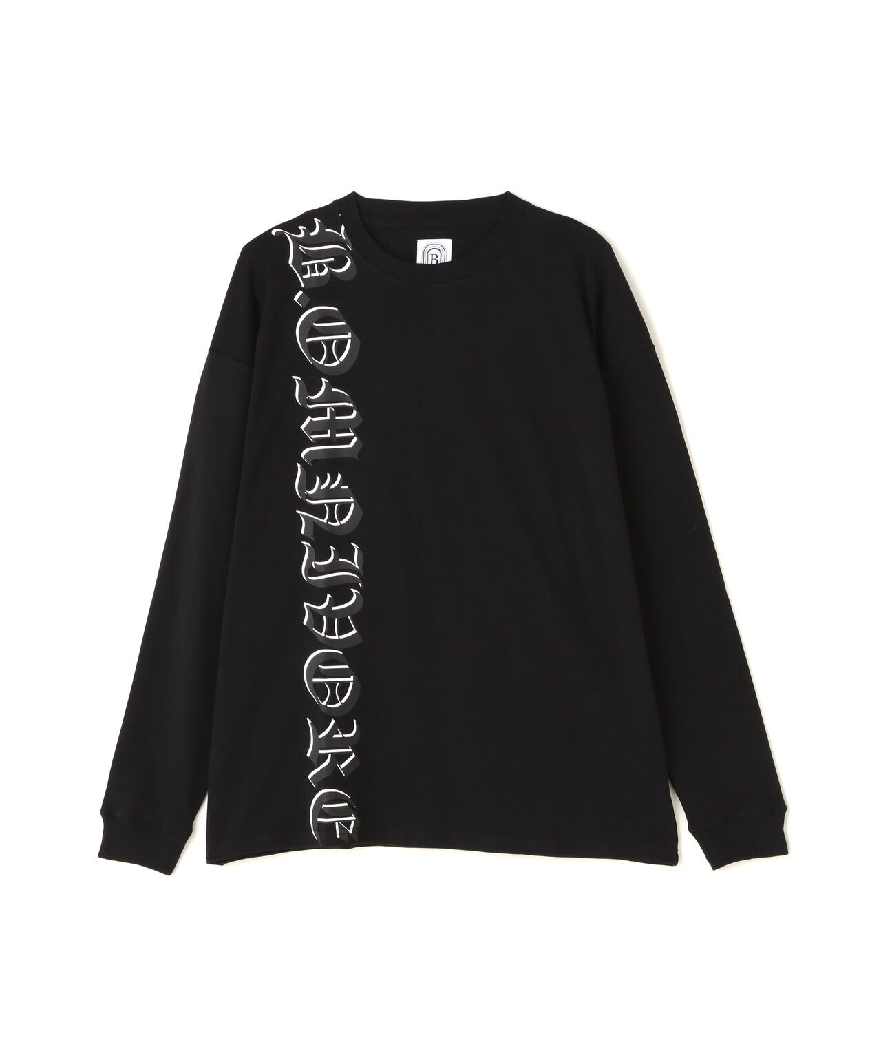 肩口から裾まで入った独特のプリント文字が特徴的なロングスリーブTシャツ