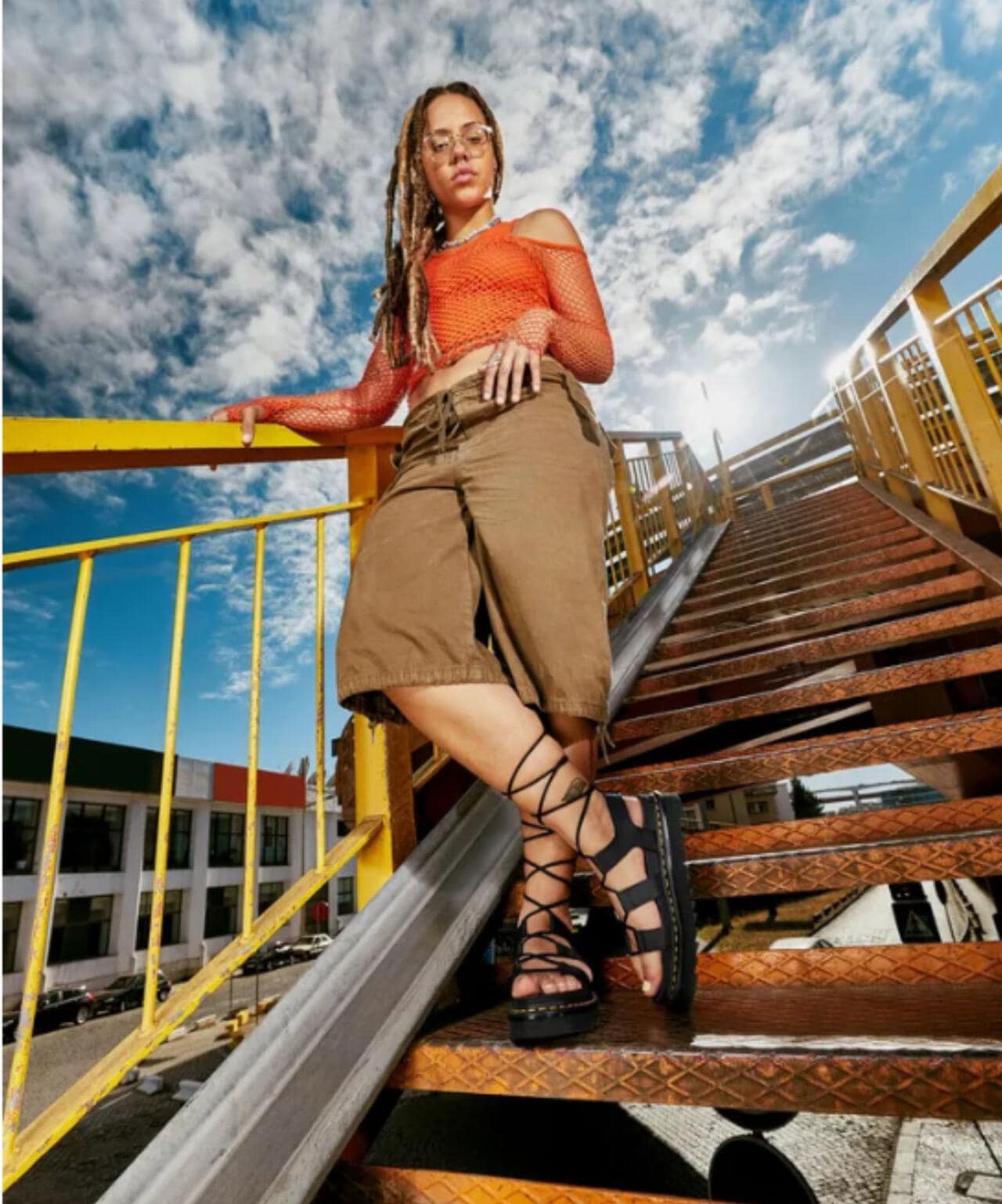 シャークソールと呼ばれるジグザグ上の靴底は、地面をしっかりと捉えて安定した歩行を提供します。編み上げサンダルの「ナルティラ サンダル」は、大胆なレースのディテールが特徴的。