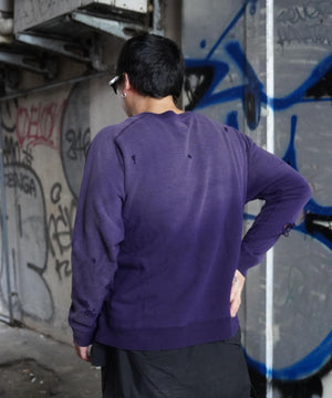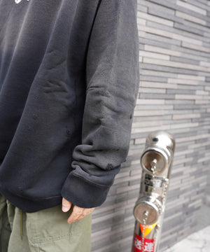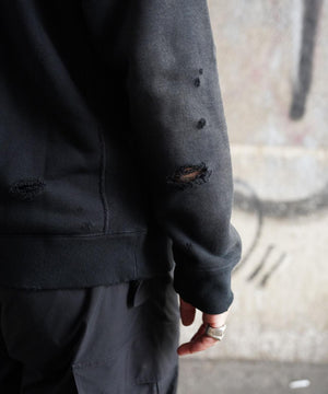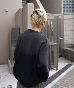 ヴィンテージスウェットのようなリアルなダメージや色褪せの加工が施されたスウェットシャツ。