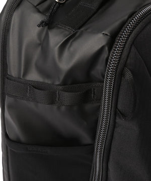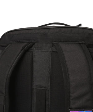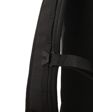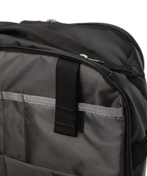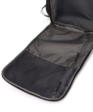 バックパネルの幅広いウェビングのループは持ち運び用ハンドルとしても、ホイール付きラゲージのハンドルに通して一体化させても使用できるデザイン