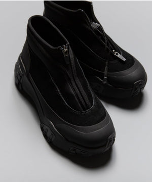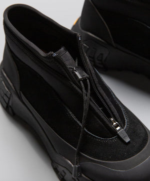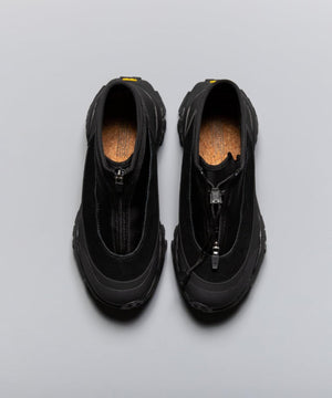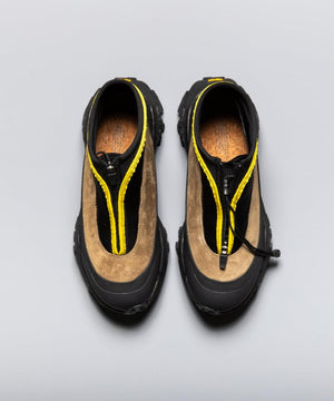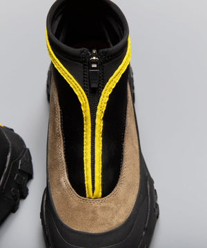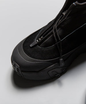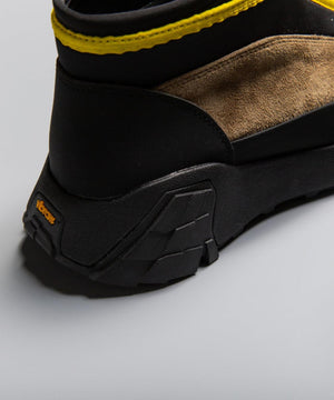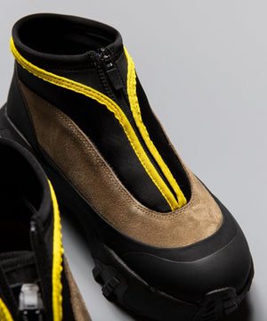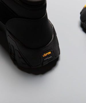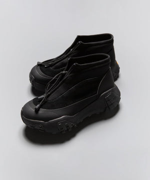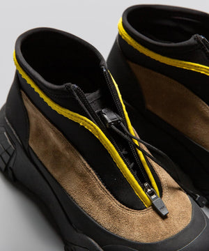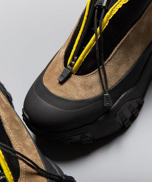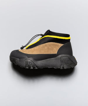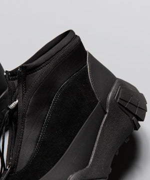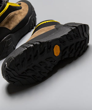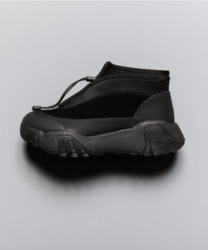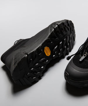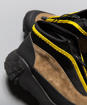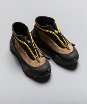 pg では初になるミッドカット仕様になります。つま先からラバー、レザー(牛革)、ネオプレーンのレイヤーで構成されたアウターとナイロンのインナーの2層構造のシューズです。インナーにはクイックシューレースシステムを初めて採用しました。シューレースを結ぶこと無くアジャスターで簡単にホールド、リリースができます。ソールはおなじみvibramのライトトレック用のソールを使用しています。見た目のボリュームに相反して軽量で底あたりも柔らかく軽快に着用できます。vibramMEGAGRIPのアウトソールにより、濡れた路面でも滑らず優れた防滑性を兼ね揃えています。街から野山までアクティブに履いて欲しいシューズです。
