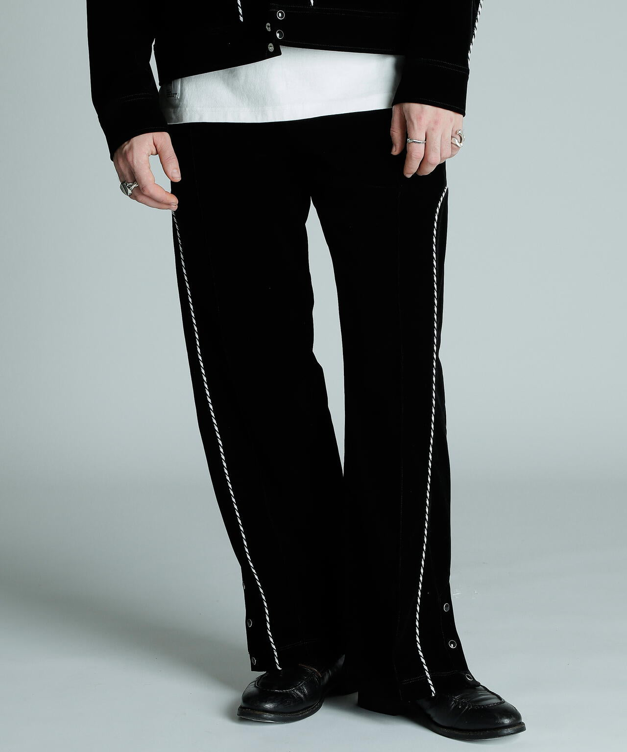 ストレートで少し太めのシルエットとベロア素材が