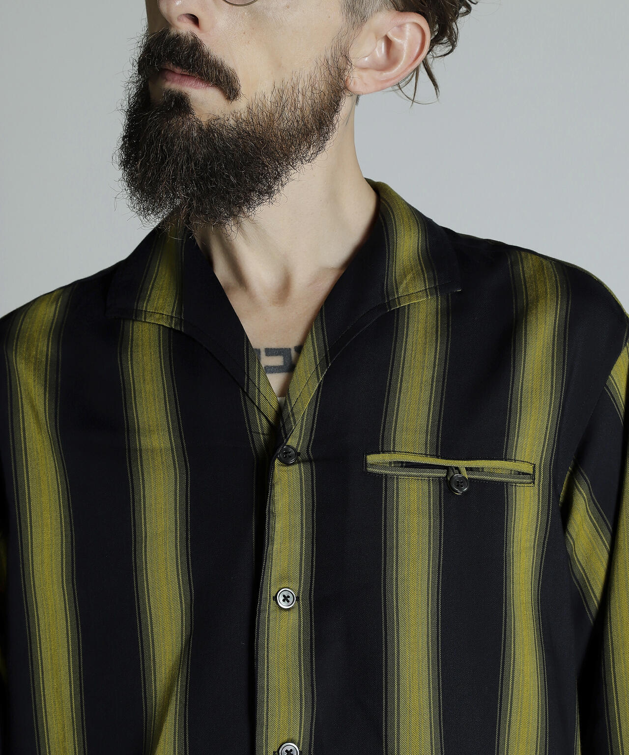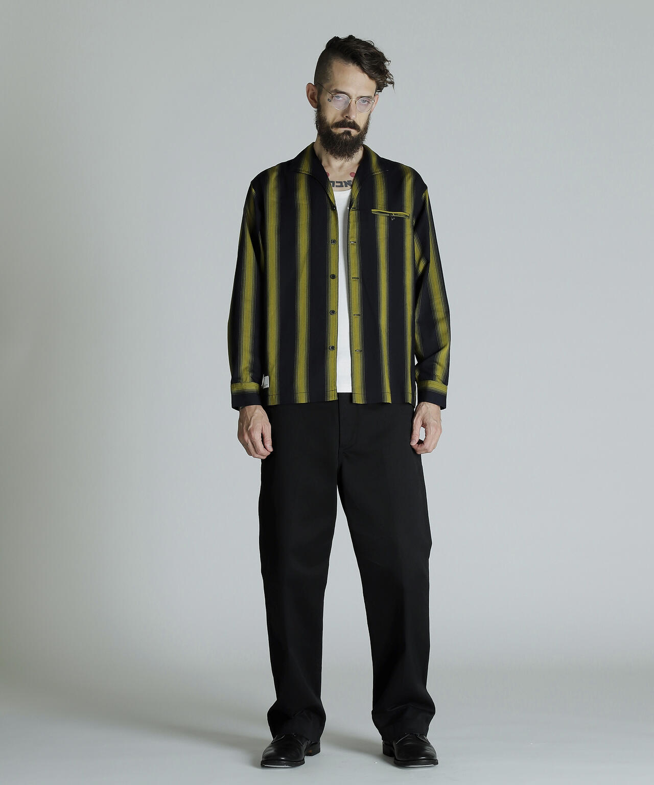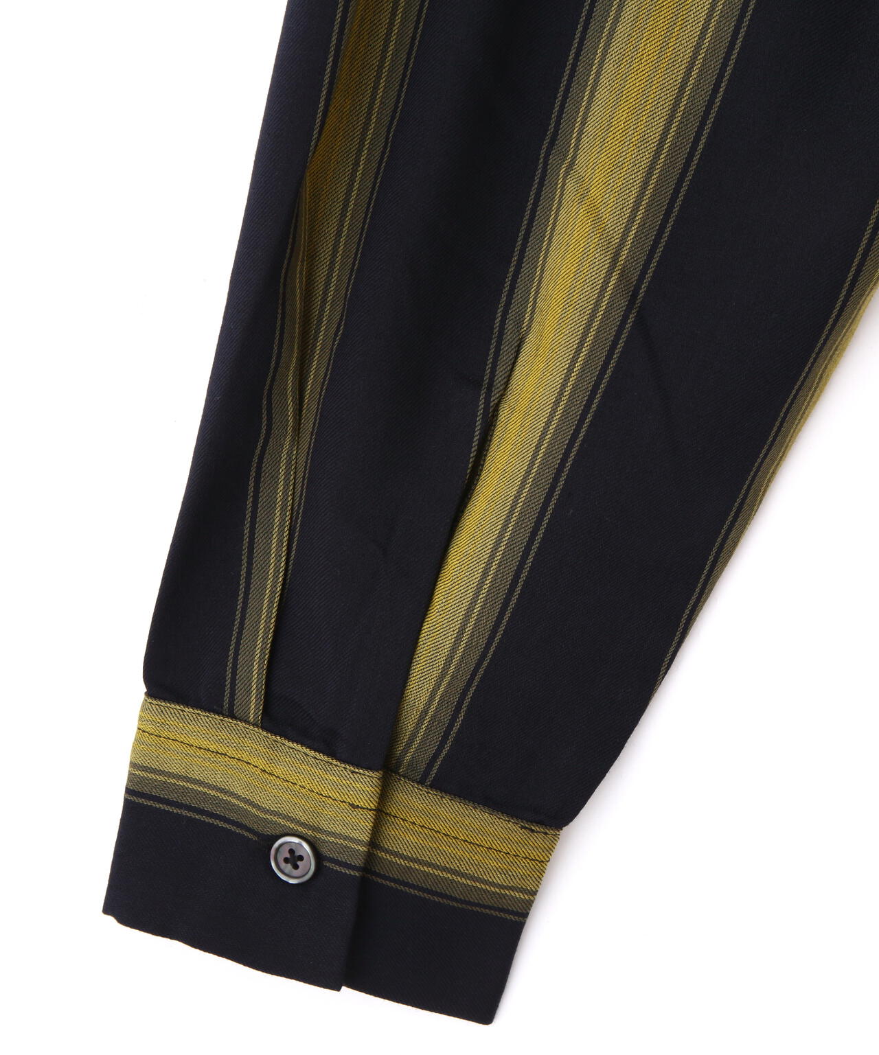 アウトローな立ち位置でもある太いピッチのストライプシャツ。