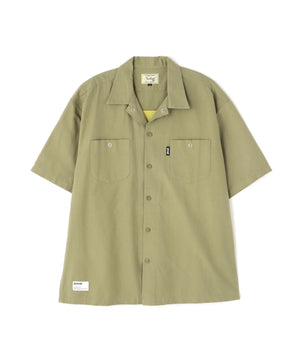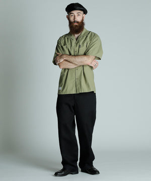 コットンとナイロンの混合ツイル素材を使用したワークシャツは、裏面をあえて使うことで、光沢を抑えたマットな質感に仕上げています。