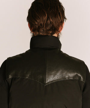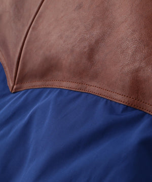 レザーコンビ部分には、ベジタブルタンニンなめしのカウレザーを使用。使い込むほどに味わい深く変化し、着る人の個性を刻んでいきます。