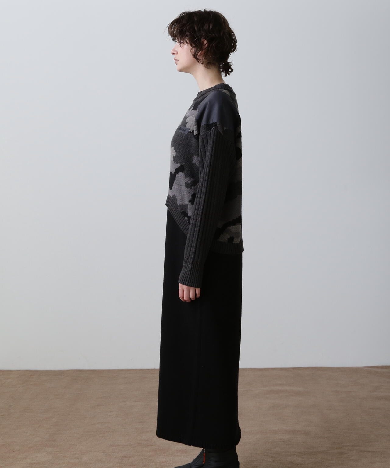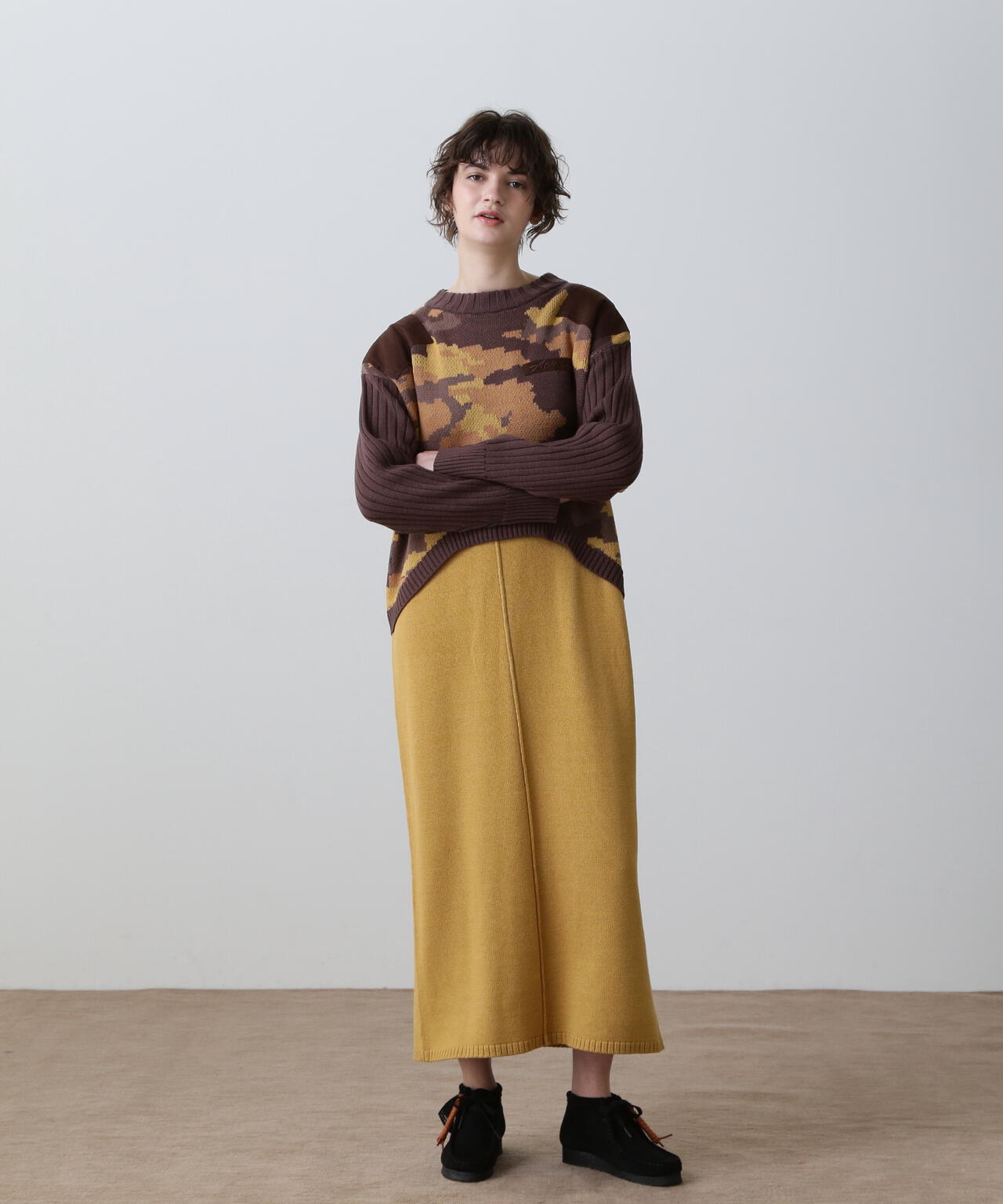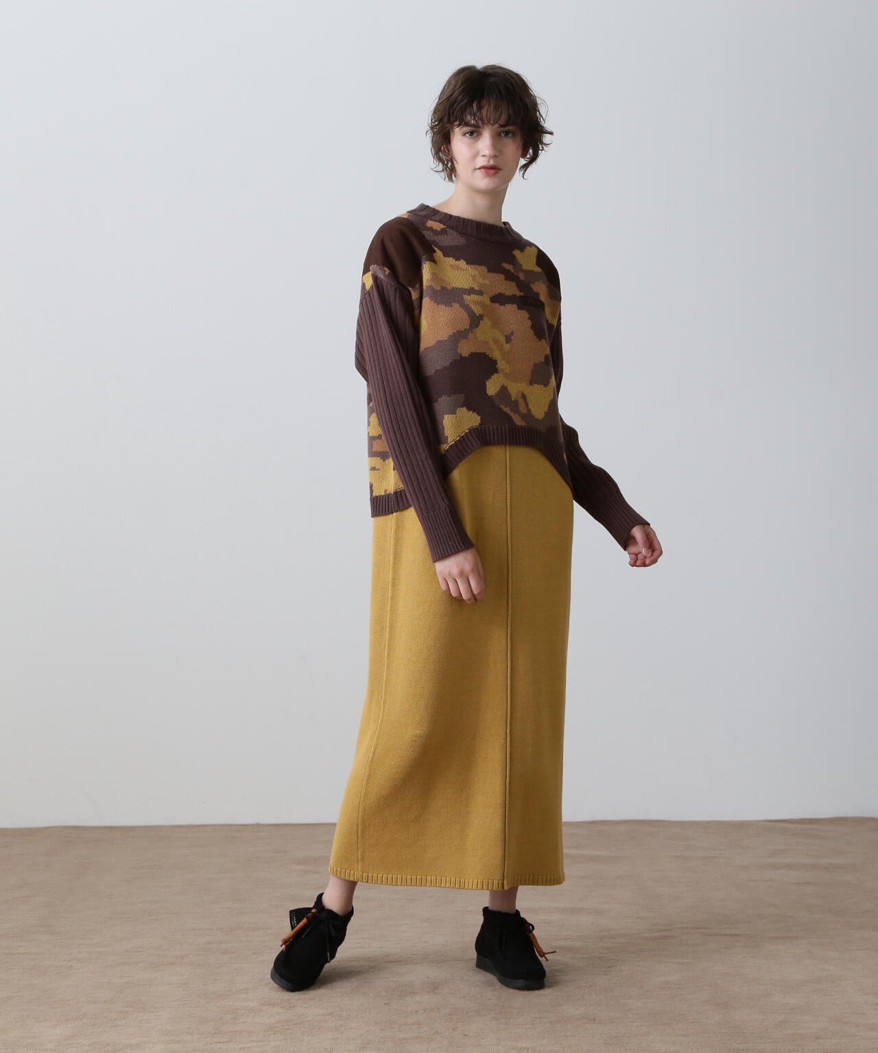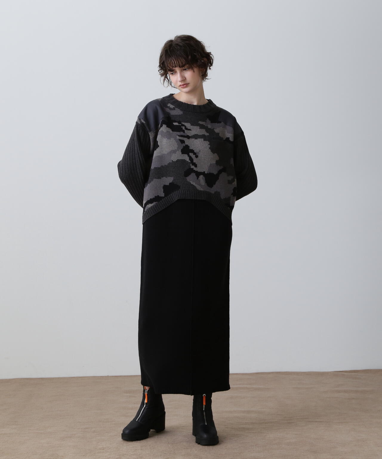 ・レイヤードライクなデザインのあるニットワンピース・ブラックとマスタードはカモフラージュ柄をミックスしたミリタリー調のクールな雰囲気・特にスカート部分はスッキリとしたシルエットに仕上げ、身体のラインをキレイにみせてくれます。