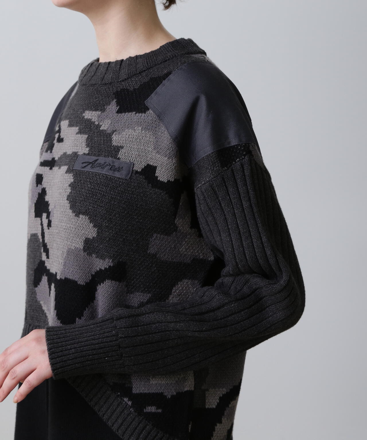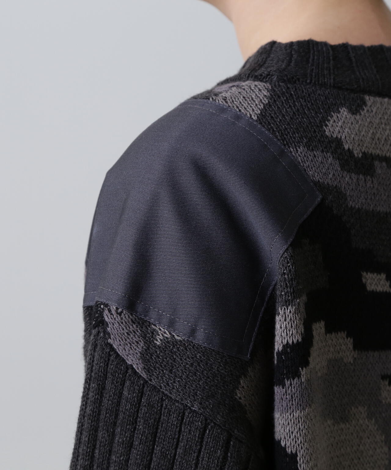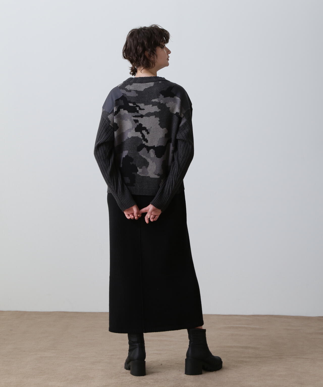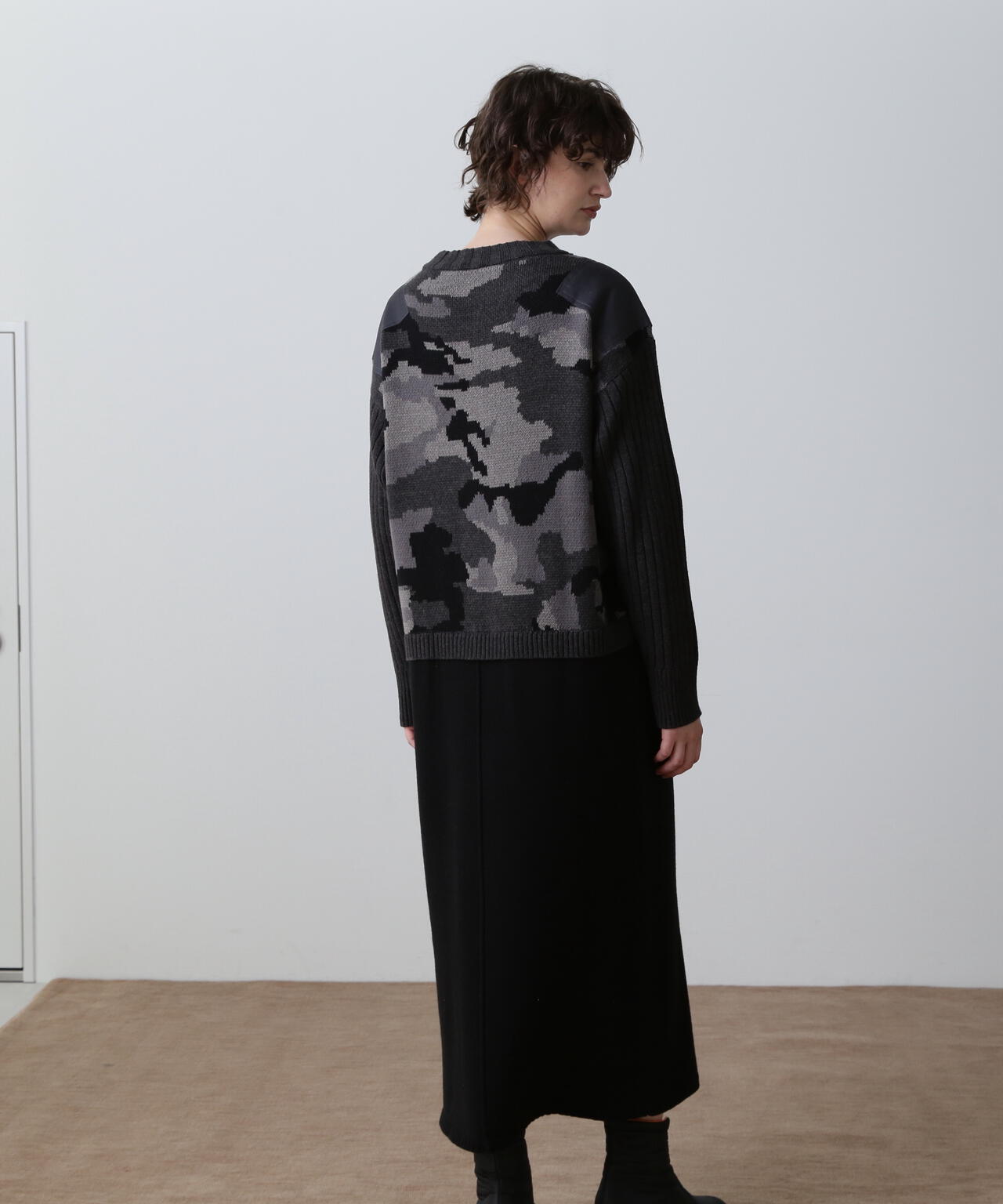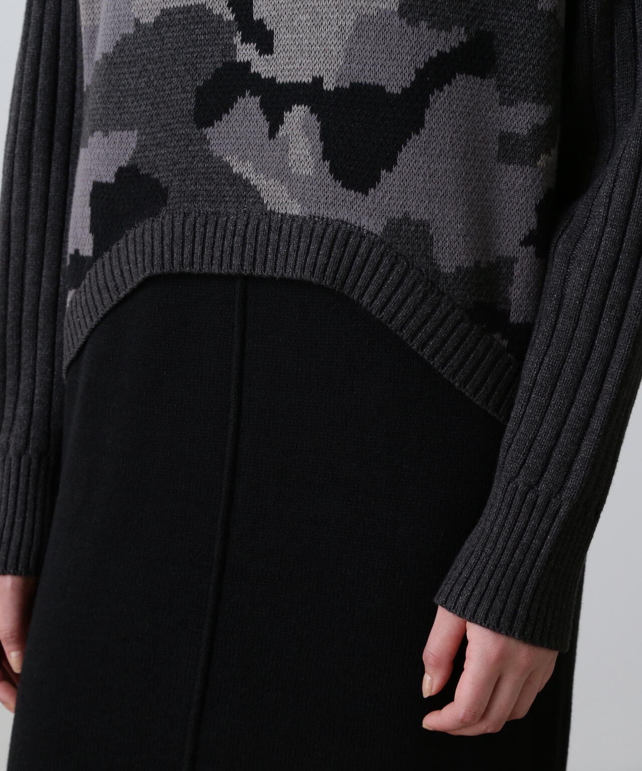 ・レイヤードライクなデザインのあるニットワンピース・ブラックとマスタードはカモフラージュ柄をミックスしたミリタリー調のクールな雰囲気・特にスカート部分はスッキリとしたシルエットに仕上げ、身体のラインをキレイにみせてくれます。