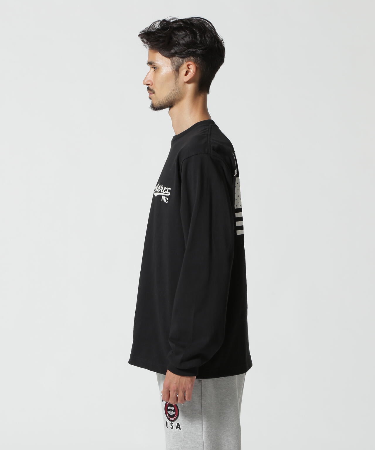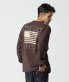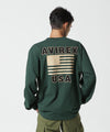 商品詳細・オリジナルで作成したコットン天竺素材を使用したロングスリーブTシャツ・左胸元にスクリプトデザインのブランドロゴを刺繍で配置・バックにはブランドロゴを刺繍アップリケで立体的表現し、プリントで星条旗を配した立体感のあるデザイン・右裾にピスネームを配置・レギュラーフィットシルエット・ブラック、ホワイト、ダークブラウン、ダークグリーンの4色展開