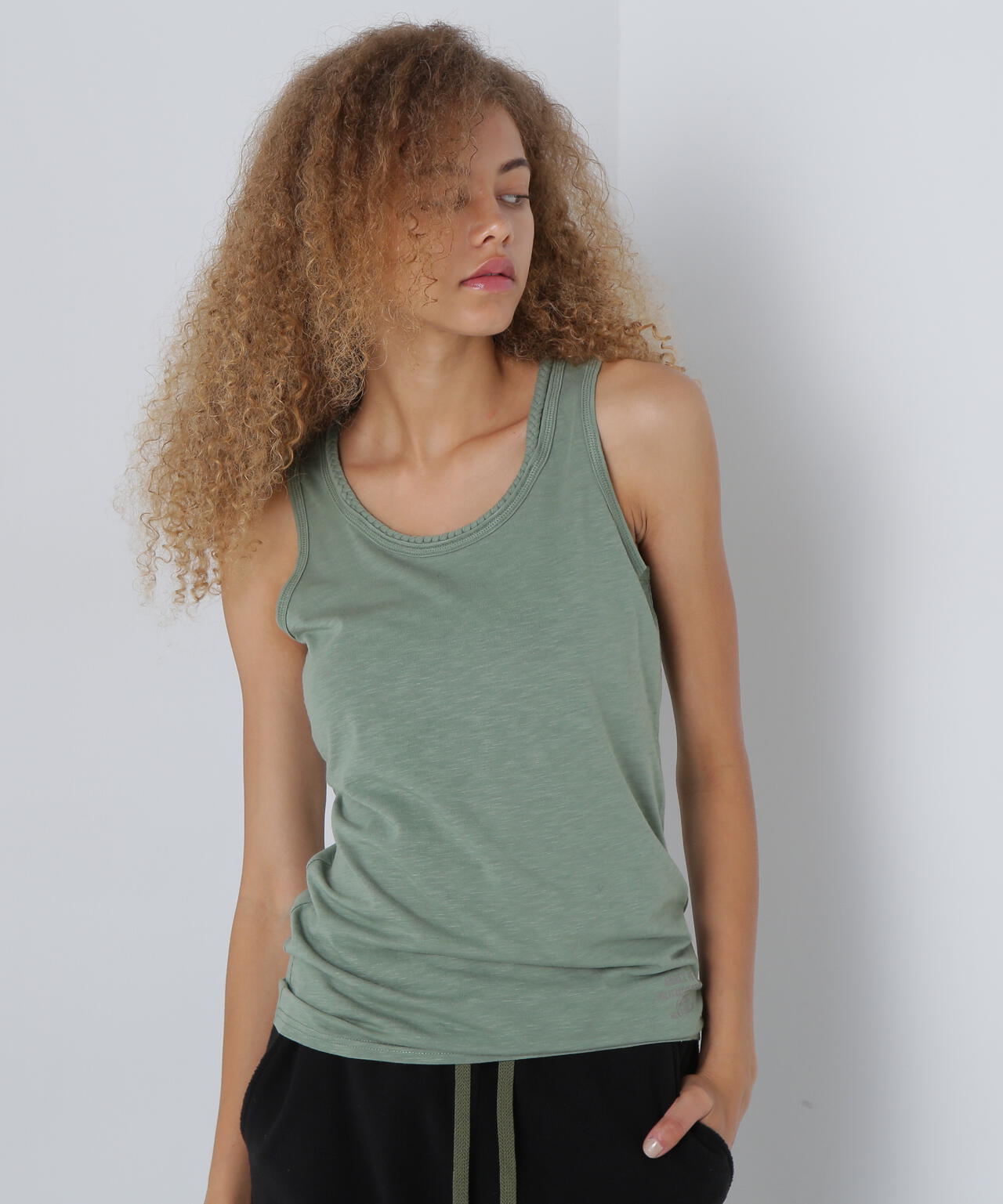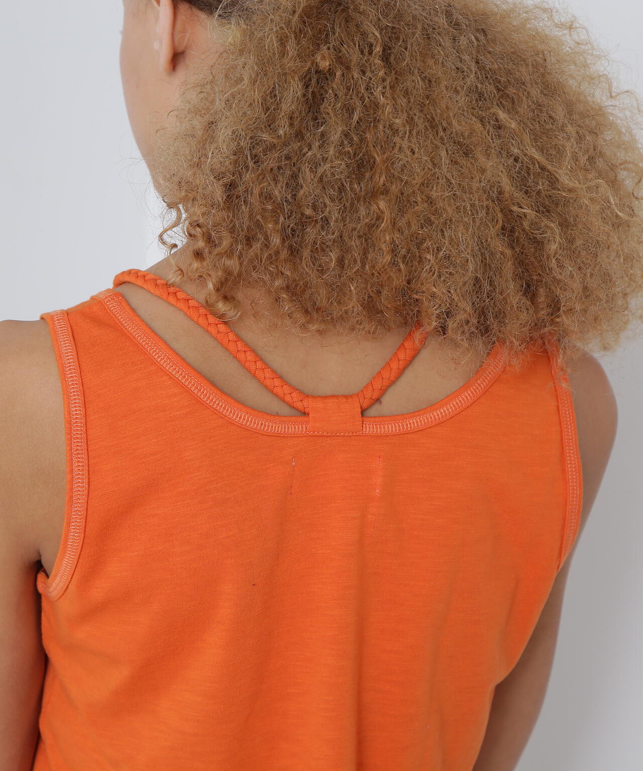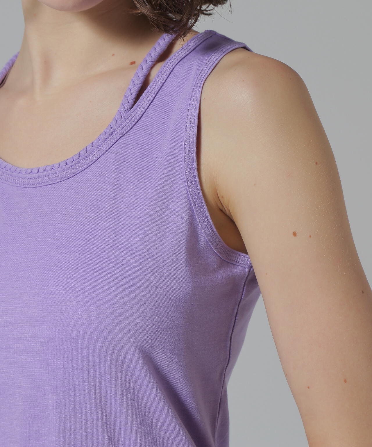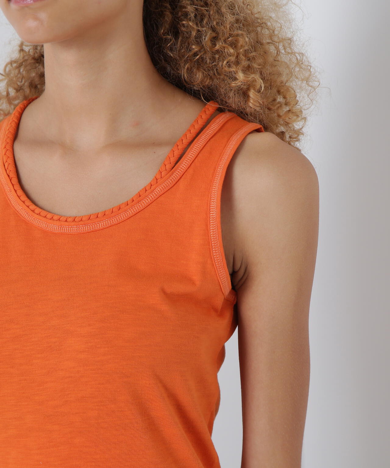 三つ編みの肩紐がポイントになるタンクトップです。