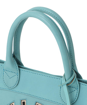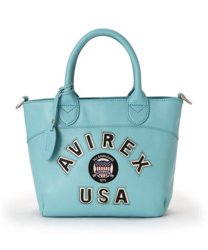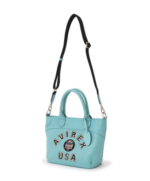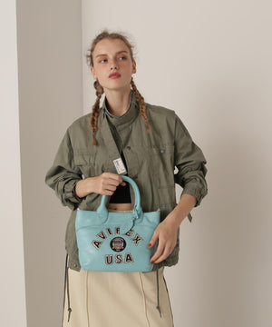 ビンテージ調の配色で統一感のあるワッペンと、レザージャケットよりインスパイアされたバーシティーロゴが印象的なミニトートバッグ。