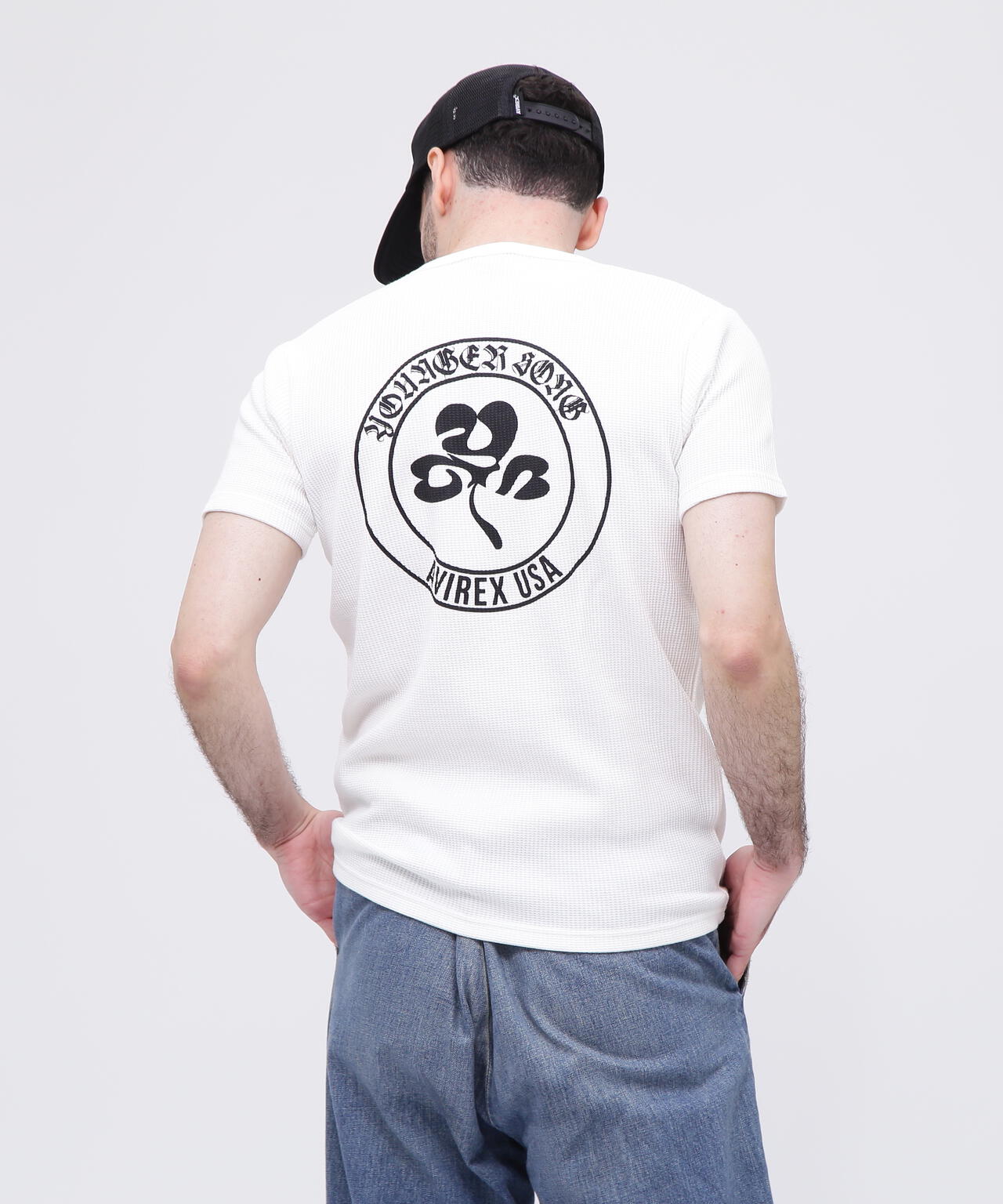 <商品詳細>・アヴィレックスとヤンガーソングのコラボ、ワッフルTシャツ・背中にはYoungerSongのシンボル的なクローバーロゴをプリント・背中のサークル部分に各ブランドロゴをプリント・胸にはコラボらしいパッチ仕様・オールドイングリッシュのフォントを使ったYoungerSongのロゴ・綿とポリエステルのワッフル生地を仕様・レギュラーサイズのサーマル半袖Tシャツ・肌触りも良く速乾性に優れている