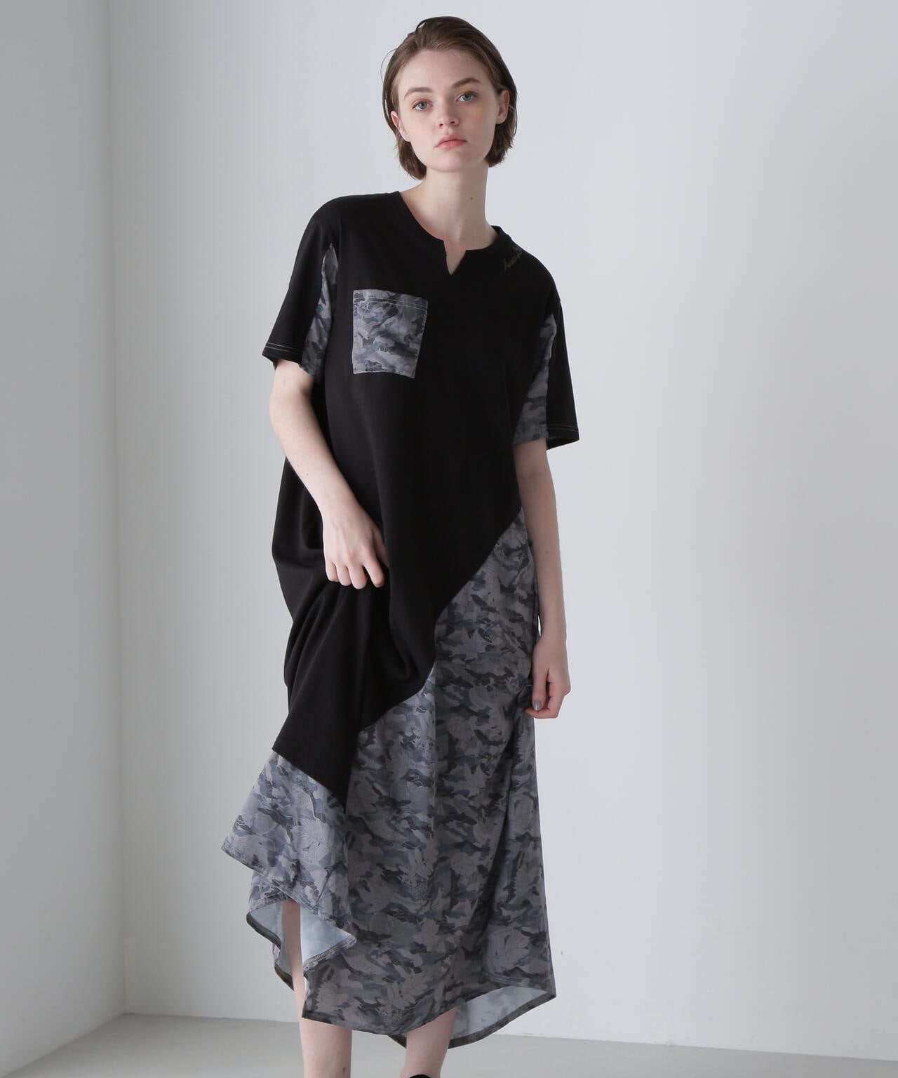 ・アシンメトリーに入ったカモフラージュ柄がアクセントになったワンピース・カットソー素材に、動きのある柔らかな生地を組み合わせ、夏らしい涼し気な印象・首元のキーネックのカッティングが女性らしく、顔周りをさり気なくスッキリとみせてくれます。