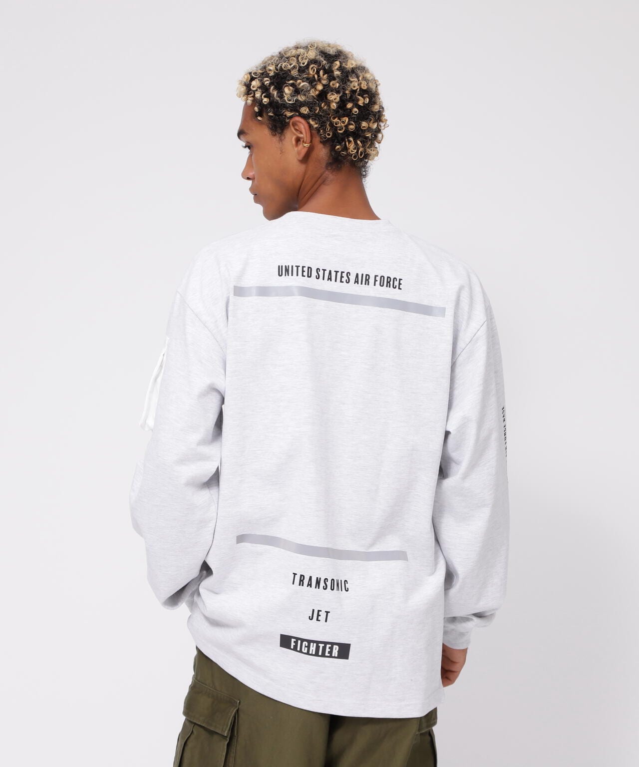 <商品詳細>・アヴィレックスらしいギミック満載の長袖Tシャツ・第94戦闘飛行隊をモチーフにしたステンシルデザイン・"HAT IN THE RING"="挑戦者になる意志を示す"・サイドのジップがアクセント・ステンシルをプリントで表現・ゆったりとしたシルエット