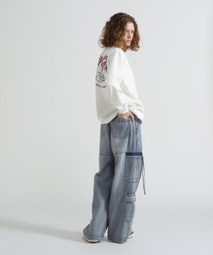 アメカジ感あふれるグラフィックを活かすようカーゴパンツやワンウォッシュ程度のデニムに合わせるのがオススメ。