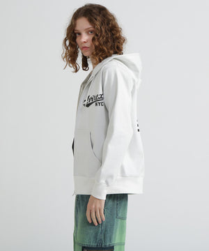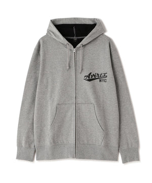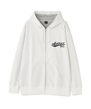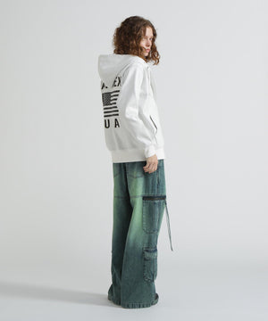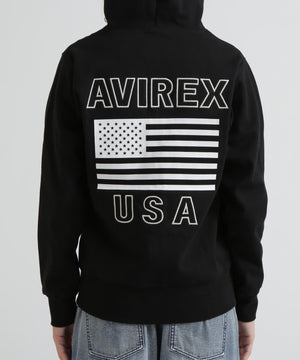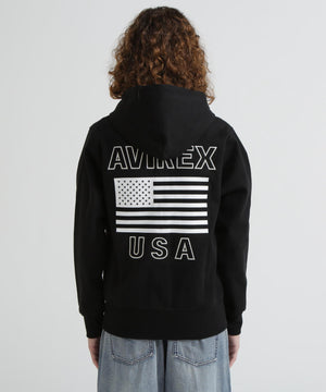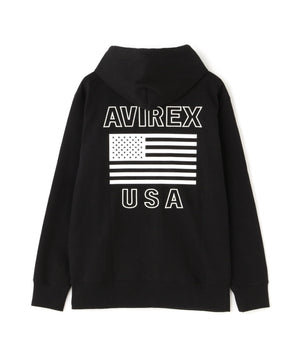 背中に大きく星条旗,ブランドロゴが入ったジップアップのパーカー。