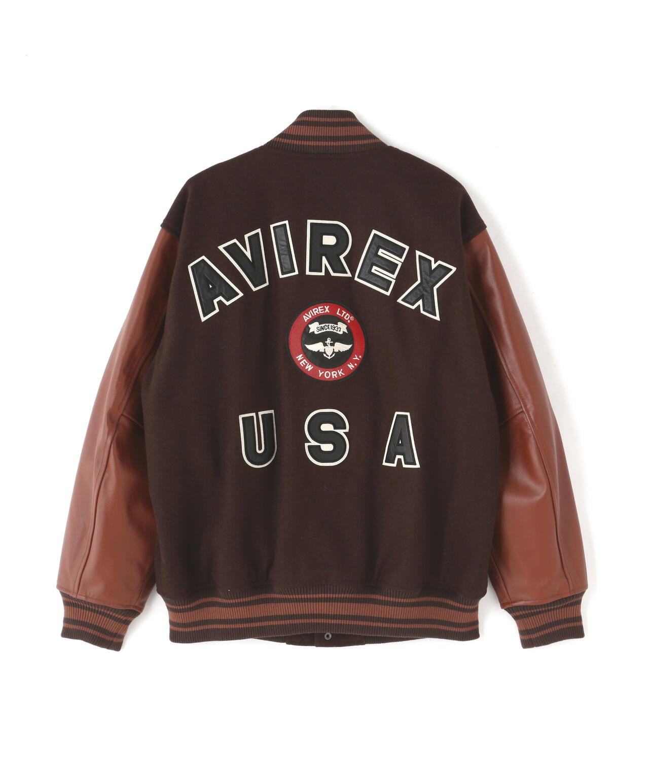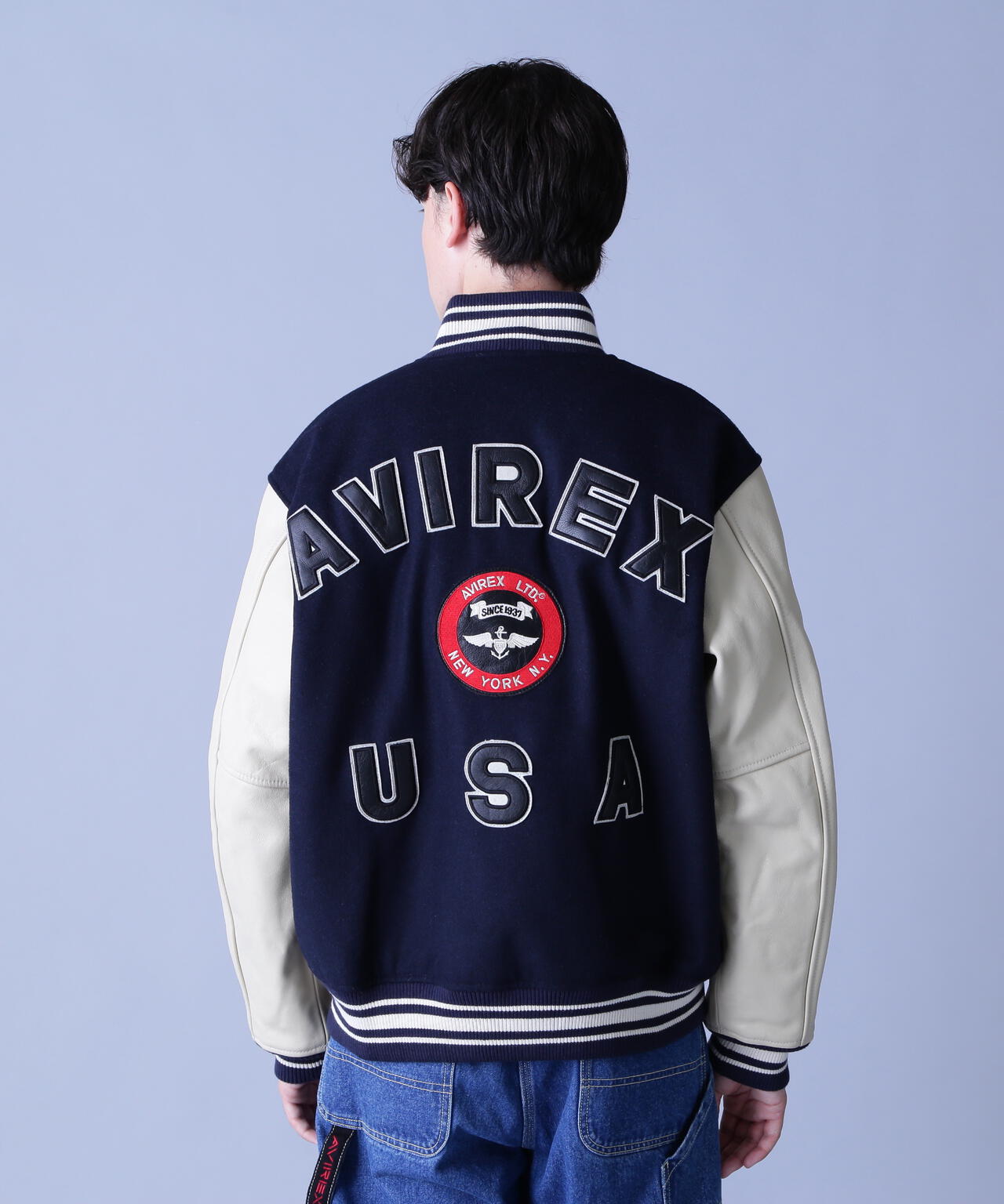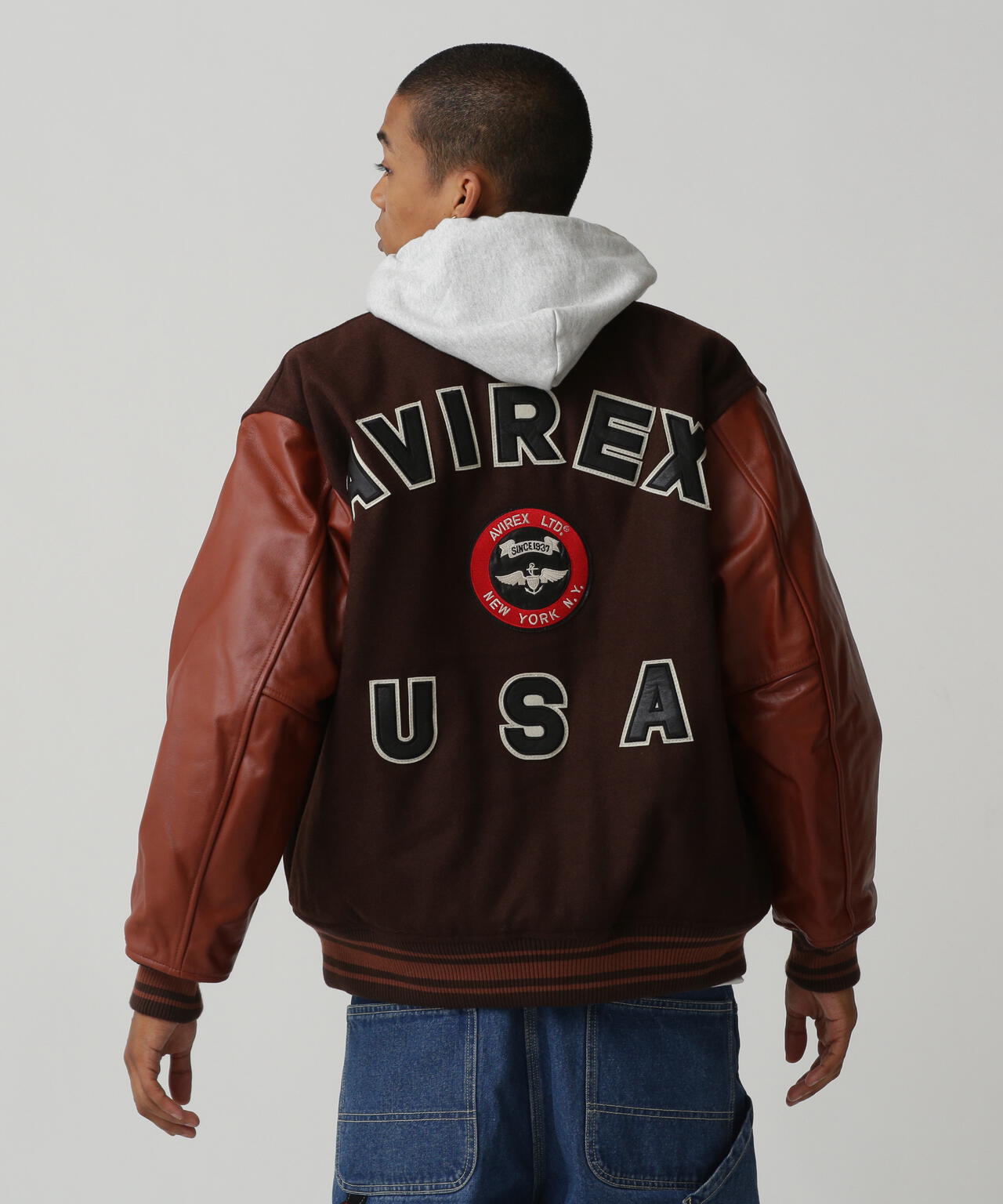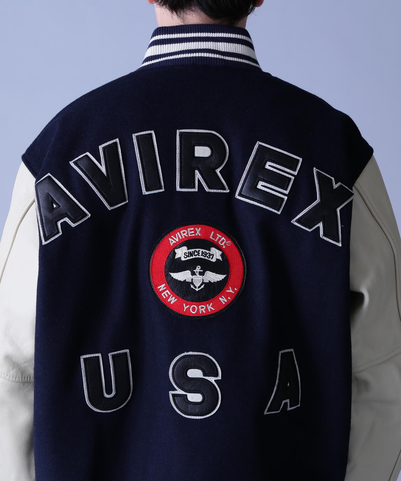 《商品詳細》・メルトンとカウレザーコンビの王道のアメカジらしいスタジャン・90年代のネオビンテージ感漂うカラーリング・背中には「AVIREX USA」のブランドロゴとバーシティジャケットらしいアップリケパッチ・フロント左胸にはブランドネームパッチ