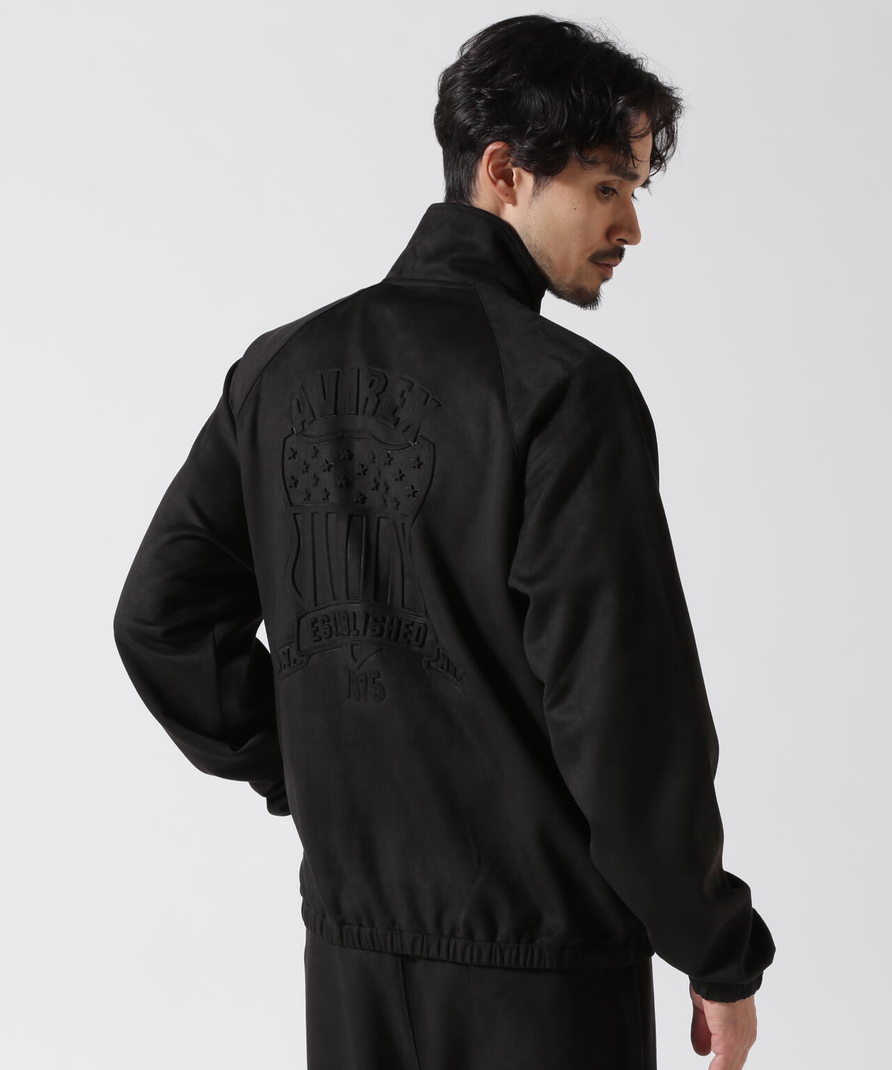 ・スエードタッチのファブリックとエンボスのブランドエンブレムが印象的なトラックジャケット