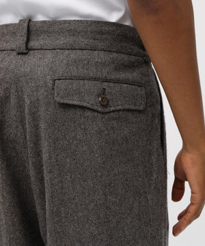 上質な表情ながら軽やかな日本製生地を用い、深めのタックと程よいワイドシルエットで構成。緩やかなテーパードが生む美しいドレープと、端正なラインが印象的。クラシックな佇まいの中に、現代的なリラックス感を併せ持つ。